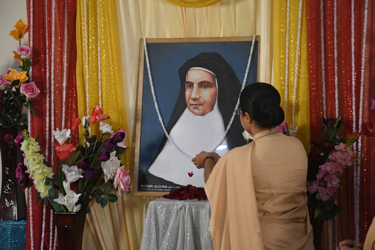 “Great achievement is usually born of great sacrifice” says, Napoleon Hill.St Agnes College has proved to be so over the past years and gratefully on Thursday 2 July 2020 celebrated the 100th Foundation Day. It was a unique way of commemorating the occasion as the 40 minutes programme was premiered in the College’s YouTube channel at 4:00 pm. The entire function was compered by Mrs Sarah Crasta who also at the end proposed the vote of thanks on behalf of the College. The programme began with a prayer song by Ms Rishel and Ms Belisha. Sr Dr M. Venissa A. C, the Principal of the College welcomed and introduced Sr Dr Lydia A.C, the Superior and Joint Secretary of St Agnes Institutions who spoke on the Zeal and Dedication of Mother Aloysia A.C – the Founder of St Agnes College. She highlighted Mother Aloysia’s farsighted vision and courage through which she kept  the torch of higher education burning bright. A floral tribute was then offered to Mother Aloysia by Sr Dr Lydia A.C, Sr Dr Venissa A.C, Sr Carmel Rita A.C and Sr Roopa Rodrigues A.C.