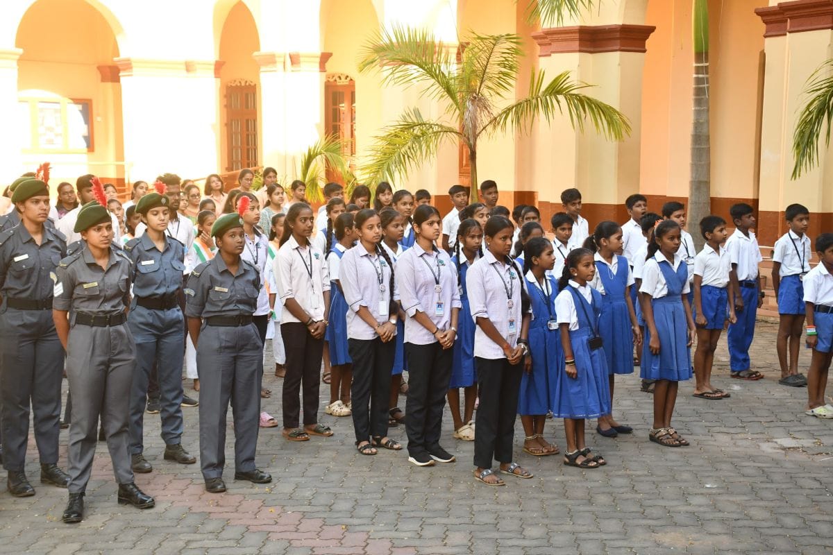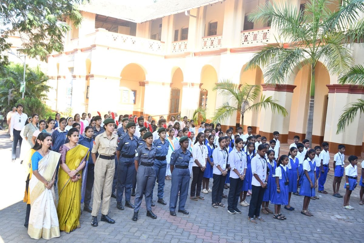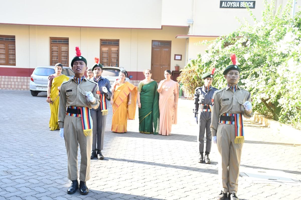 Following this, the Preamble of the Constitution was recited, symbolizing the cornerstone of our democratic principles, and everyone joined in unison to repeat it. The other dignitaries were Sr. Dr. M Vinora A.C, PG Coordinator, Mrs Shubharekha, Registrar; who were escorted by the NCC cadets along with the ANOs of NCC Army and Air wing, Capt. Gayathri BK and FlgOffr. Dr Hithakshi B.