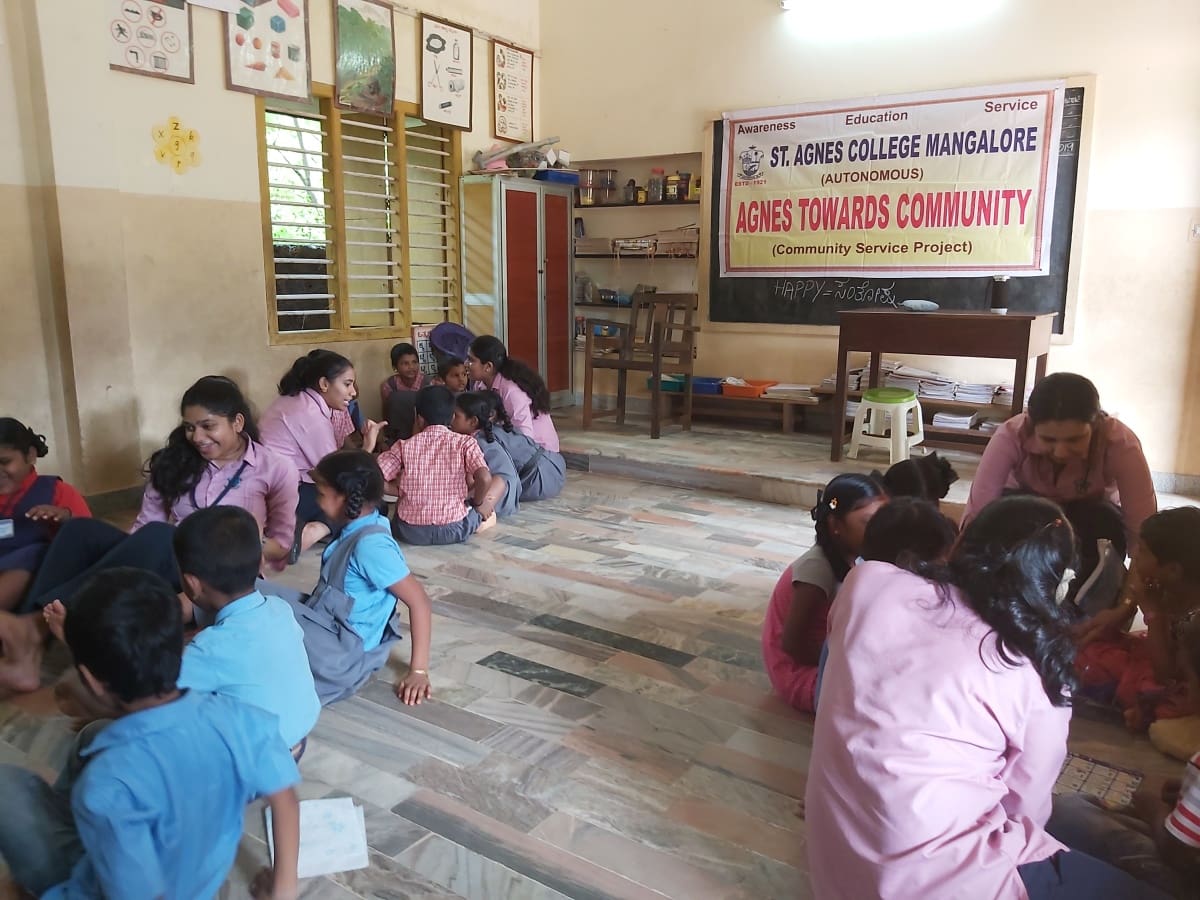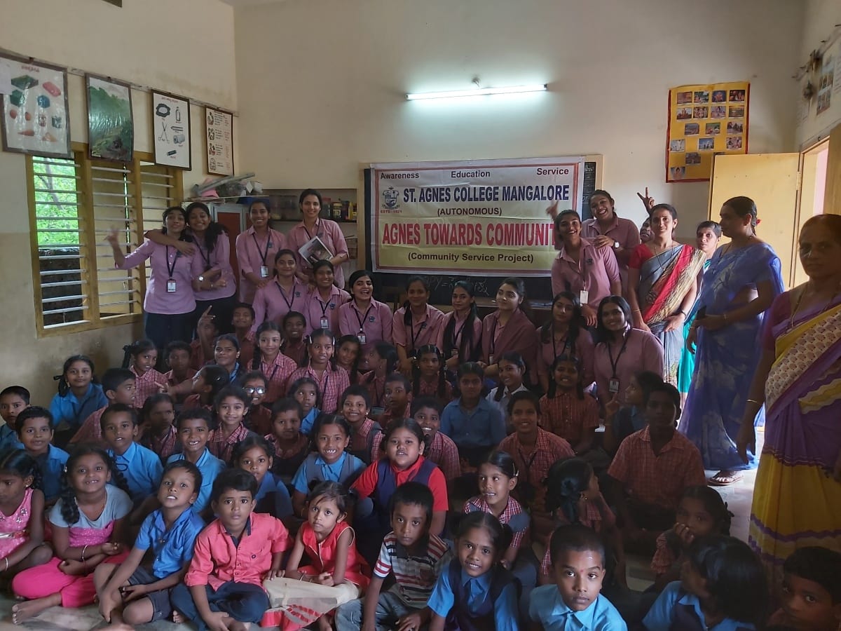 The final year students of III BBA Visited Dakshina Kannada Zilla Panchayat Govt Higher Primary School, Hosabettu to conduct spoken English classes to the students of 1std to7th Std on 13 July 2019. The aim of implementing this activity was to train the young minds to improve their English language. The pupils of the school were divided into different groups and under each group two students were allotted to teach them English. The student of St Agnes College used creative methods to train the young minds. The Primary students were also taught some action songs in English. All the students of the school enthusiastically participated and learned to introduce themselves to the audience. They also learned new words and how to converse in English. 54 primary students were the beneficiaries of this activity.