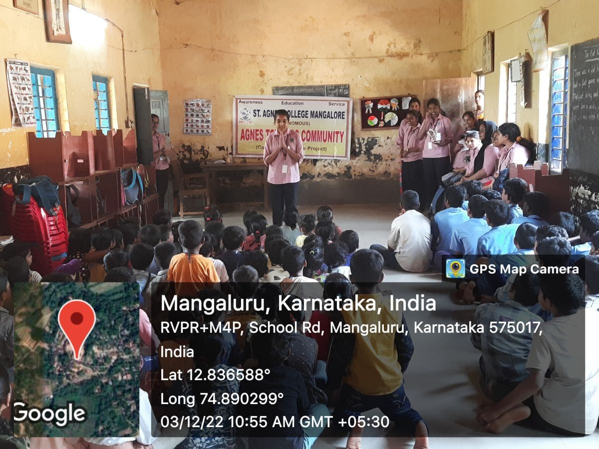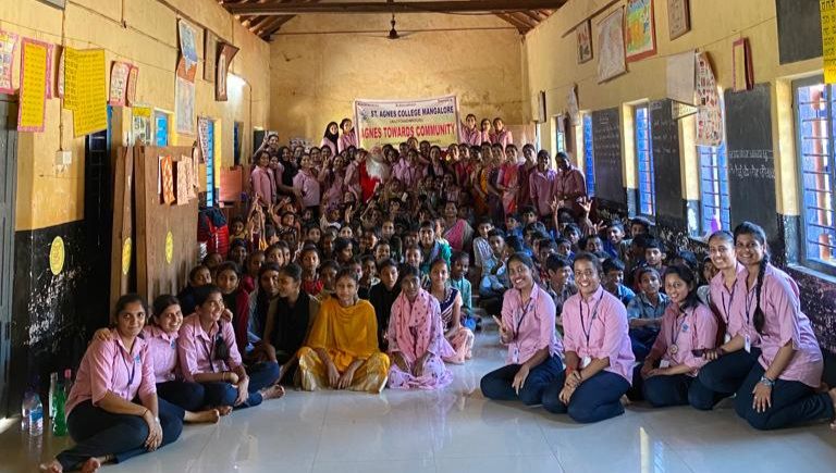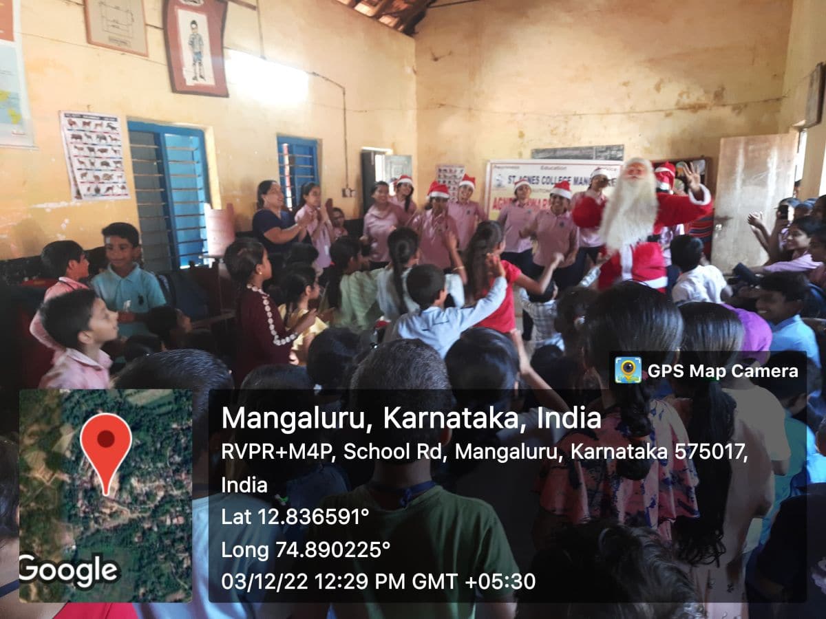 Children from first to seventh standard were asked to assemble in a hall. Students began the programme with the prayer song and performed a skit on impact of social media in our daily life and cleanliness which helped the children to know the importance of cleanliness and pros and cons of social media. Fun games like passing the ball and bomb in the city were conducted. The winners were awarded with chocolate and colourful stationary items. The students were taught some easy and enjoyable action songs which helped them to learn the various parts of their body in English. Students of III B.Com. performed dance on the theme of Christmas. Students were very happy to see Santa Claus and enjoyed a lot.