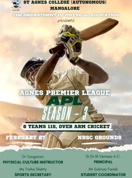 The APL Cricket Season-3 came to a thrilling close on February 27, 2025, at the College Ground. The event was graced by esteemed guests, including Sr Dr M Venissa A. C., Principal, Sr Dr Roopa Rodriguez A. C., Vice Principal, and Dr. Tangarani, Physical Director. A total of 117 students from various departments participated in the tournament, which featured 9 teams. The event showcased their skills, teamwork, and sportsmanship. After intense competition, MCA A emerged as the Champions, with Royal MBA securing the Runner-up position.