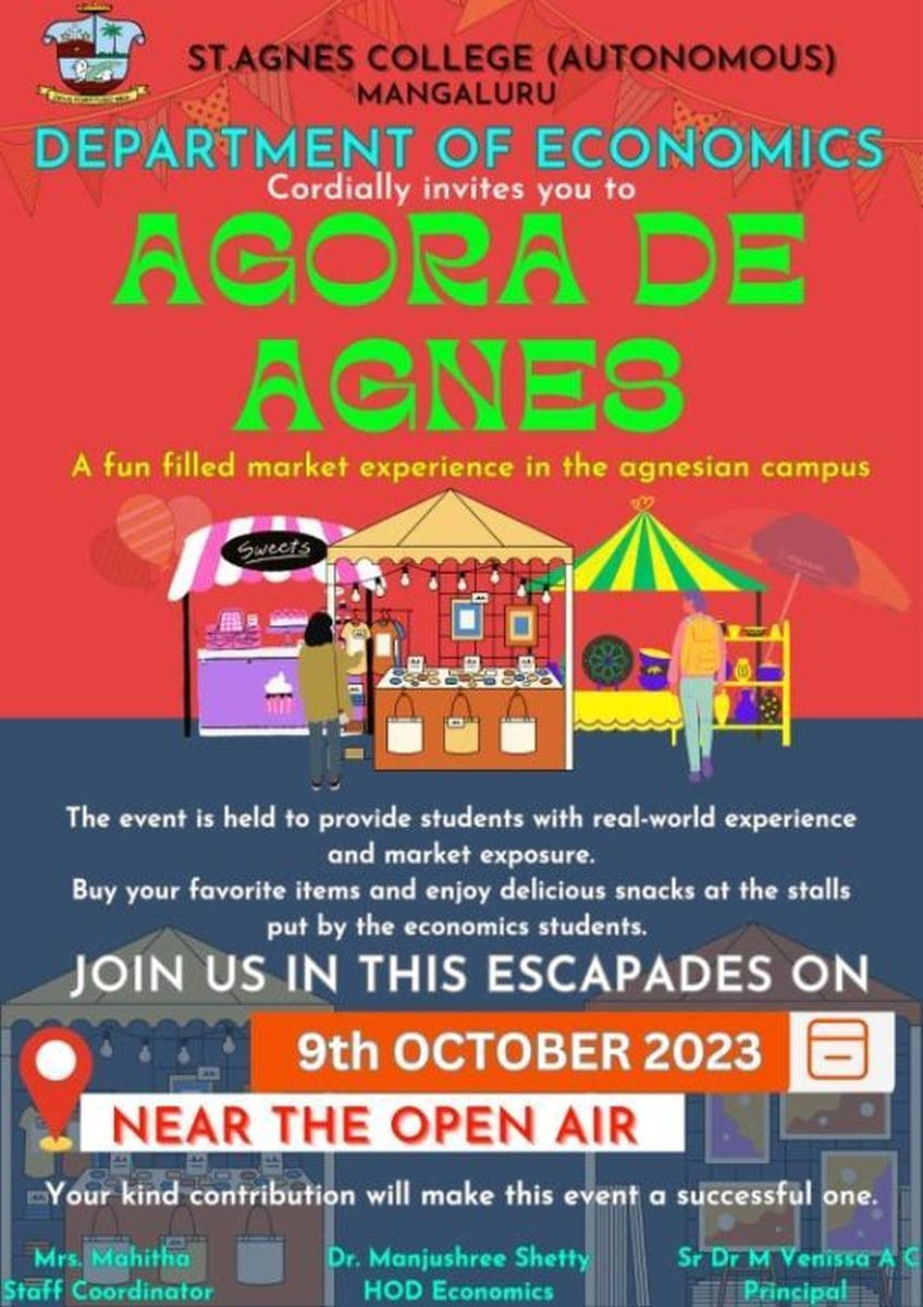 On 9 October 2023, the Department of Economics, St Agnes College (Autonomous), Mangaluru conducted Agora de Agnes, a fun filled market experience for the Economics students of St Agnes College. Agora de Agnes stands for market of Agnes. It was conducted under the guidance of Mrs Manjushree Shetty, Head, Department of Economics and Mrs Mahitha, Assistant Professor, Department of Economics. Students had put up various stalls selling a variety of items ranging from snacks to handicrafts along with exciting games. The food stalls ranged from home baked cakes to spicy pani puris and refreshing mojitos.