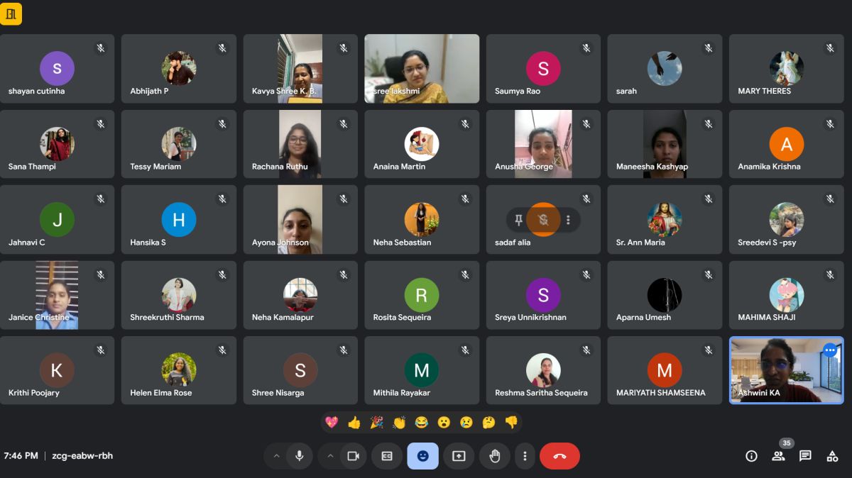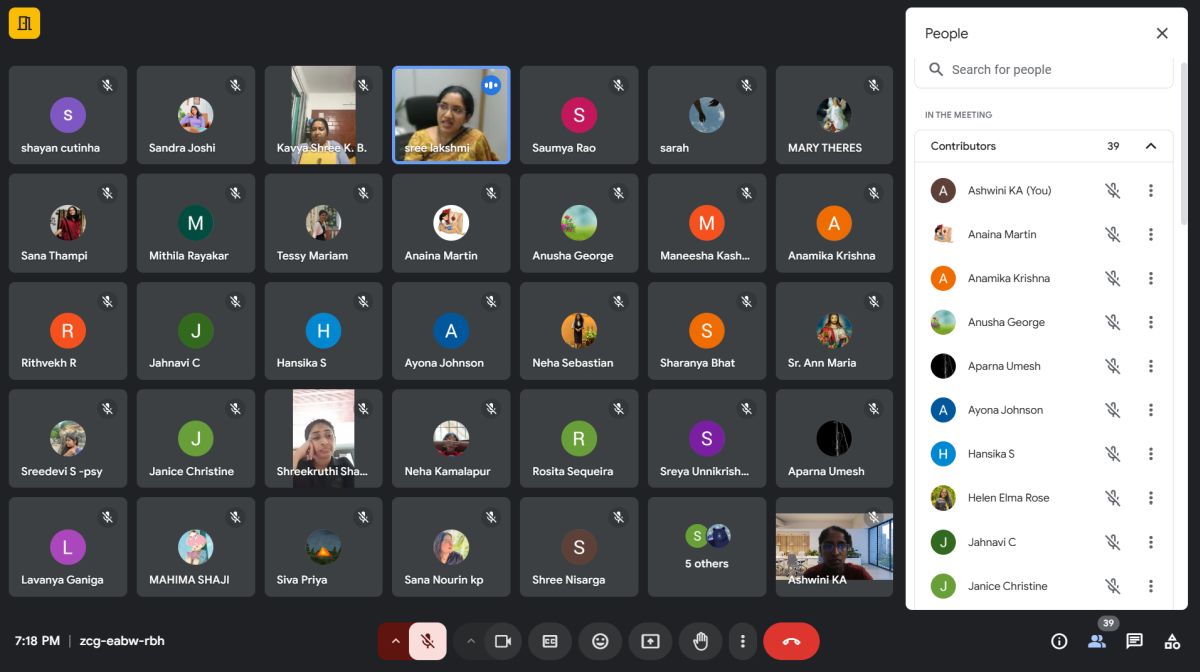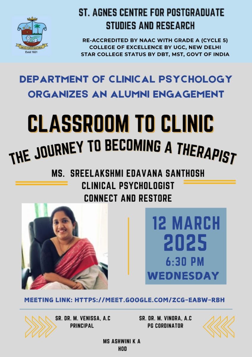 The session commenced with a warm welcome by Ms. Ashwini K A, Head of the Department, Department of clinical psychology followed by an introduction of the speaker by Ms. Sandra Joshy, 2nd year Msc clinical psychology. The invited speaker, Ms. Sreelakshmi Edavana Santhosh, a distinguished clinical psychologist. In session she shared her journey from being a student at St. Agnes college to the profession, Clinical Psychologist. She elaborated on how her education, training, and internships at St. Agnes shaped her skills and prepared her for professional practice.