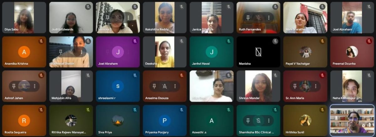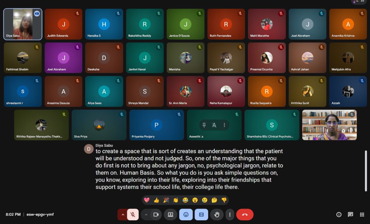 The session began with a welcome address by Ms. Ashwini K. A., Head of the Department, followed by the MC by Judith Michelle Edwards and the introduction of the speaker by Ms. Anamika Krishna. The invited speaker, Ms. Diya, trainee clinical psychologist and alumna of St. Agnes, shared her journey from being a student to a trainee professional, highlighting the role of academic training, internships, and self-awareness in clinical work.