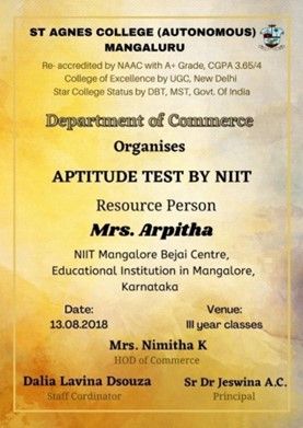 The Department of Commerce, St Agnes College (Autonomous), Mangaluru organized a session on “How to Solve Aptitude Tests”, for the final year B.Com students on 13 August 2018. The resource person was Mrs. Arpitha from NIIT Mangalore Bejai Centre, Educational Institution, Mangalore, Karnataka. The aim of the aptitude test was to assess the students’ capabilities and predict what they are able to learn, as well as evaluate their academic potential and career suitability.