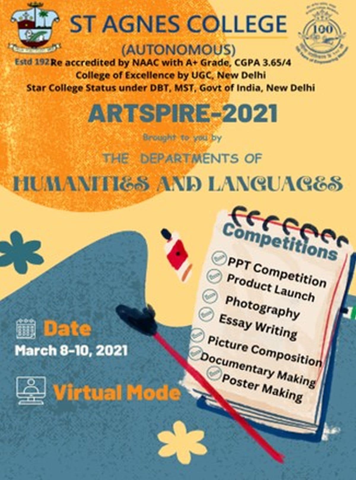 Artspire 2021, an interdepartmental competition of Humanities and Languages, St Agnes College (Autonomous), Mangaluru was successfully conducted in virtual mode, with the respective department faculty overseeing their competitions. The event featured morning and afternoon sessions from 8 to 10 March 2021, and witnessed enthusiastic participation from students, resulting in numerous prize winners.