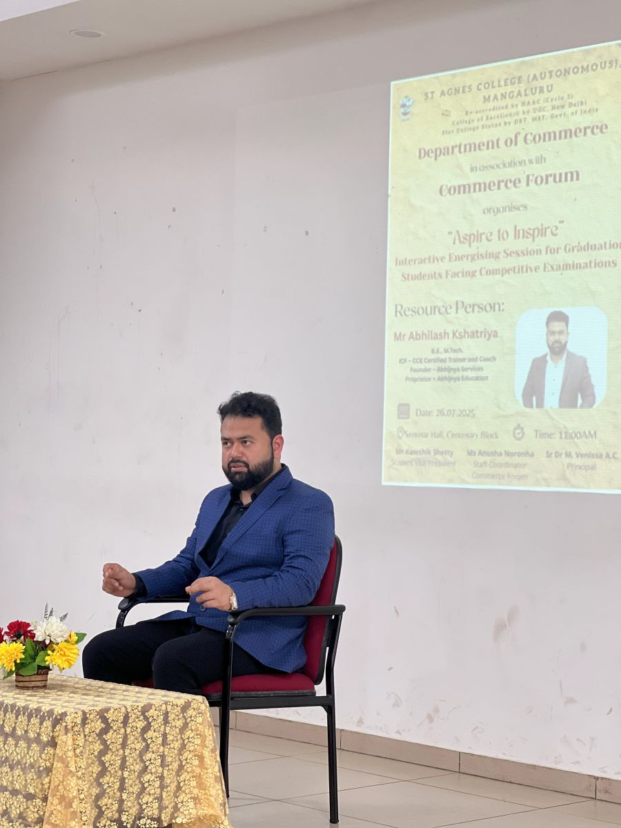 The Department of Commerce, in association with the Commerce Forum, organised an interactive and energising session titled “Aspire to Inspire” on July 26, 2025. The session was specifically designed for graduation students preparing for various competitive examinations. Mr. Abhilash Kshatriya, a certified trainer and founder of Abhijnya Services and Abhijnya Education was the resource person.