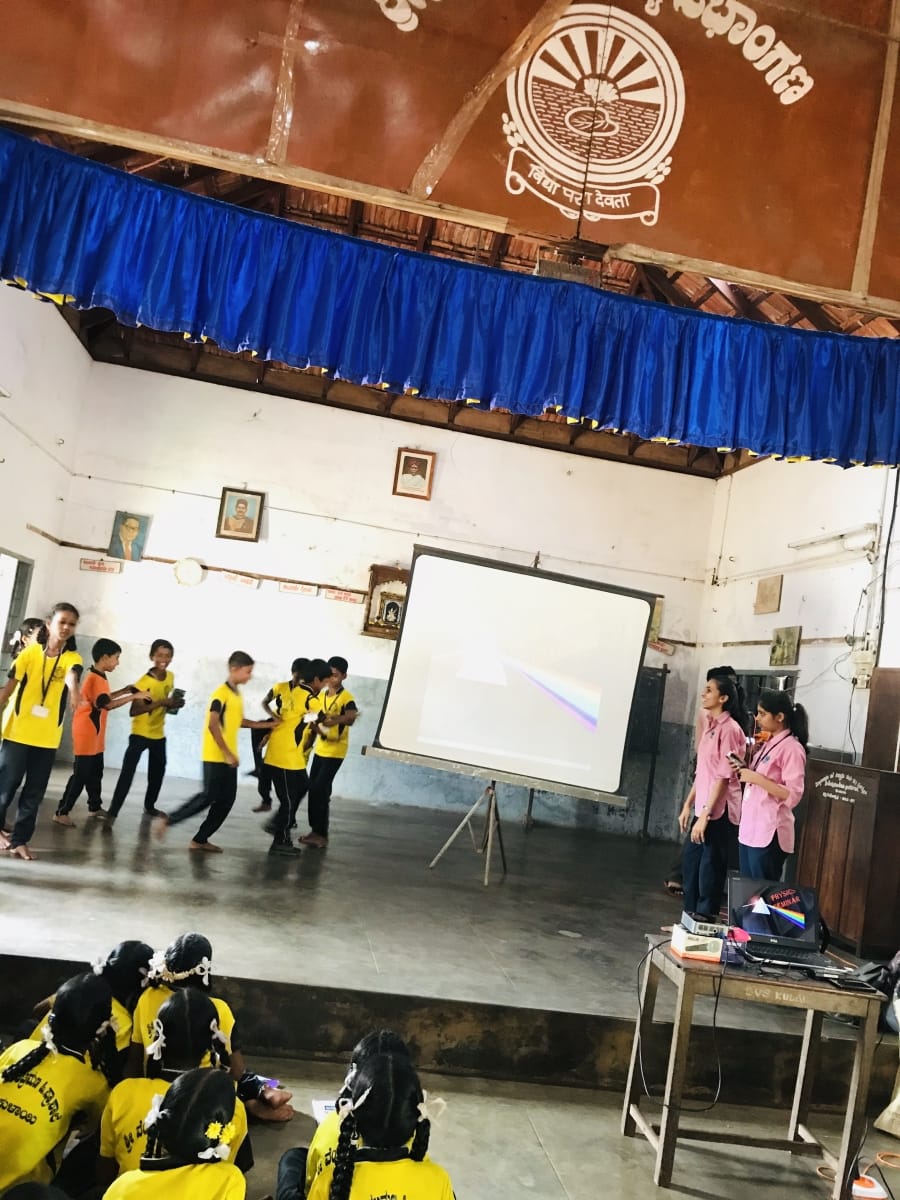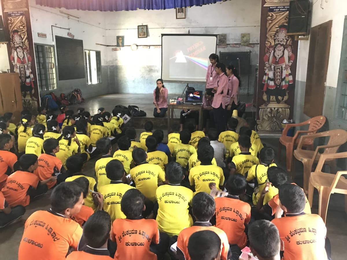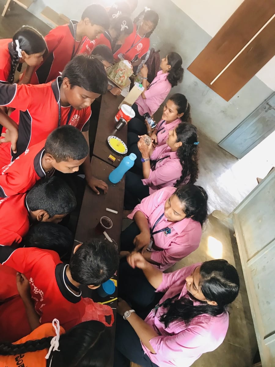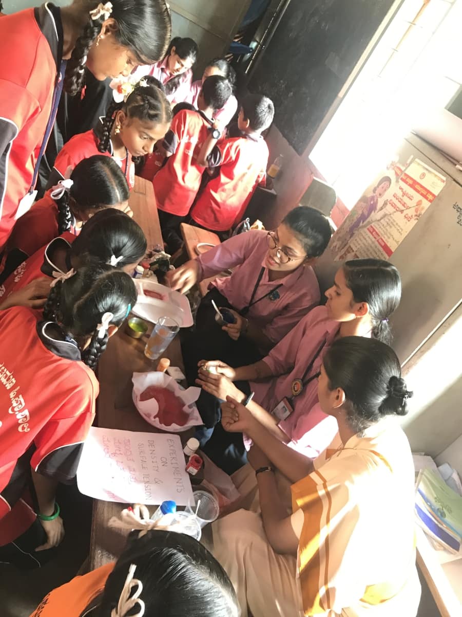 At around 10:30 am the students reached the Sri Venkataramana school premises. They were divided into two groups wherein one group had to take up power point presentation related to various topics of science while the other group had to demonstrate and explain the principles involved in various simple experiments and models. The topics chosen by the students included surface tension, density, fire extinguisher, concave and convex lens, volcanoes etc. Around 100 children were part of the activities, who were very cooperative and were curious to know about the scientific principles involved behind the experiments.