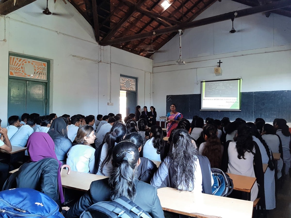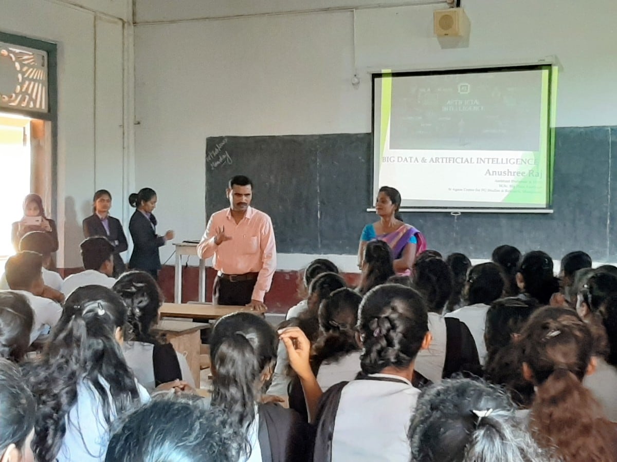 Mrs. Anushree Raj, HOD – MSc. Big Data Analytics delivered a talk on “Big Data and Artificial Intelligence” on Feb17th for BCA students at St Philomena Degree College, Puttur. Mr. Vinaya Chandra, HOD BCA Department of St Philomena College introduced the resource person to the students. Mrs. Anushree Raj addressed the student’s giving an insight on what is big data and how the data analytics plays an important role in our real life with suitable case studies and real time examples. Students were given a deep understanding on what is data analytics, big data technology, machine learning and Artificial intelligence. They were detailed on various career opportunities in the field of data analytics and data scientists also drawn attention towards the skills essential to grab a variety of professional positions. She enlightened the students by introducing them with the two courses, M.Sc. Big Data Analytics and Post Graduate Diploma in Business Data Analytics offered by the PG Department of Big Data Analytics at St Agnes College (Autonomous) Centre for Post Graduate Studies and Research, Mangaluru.