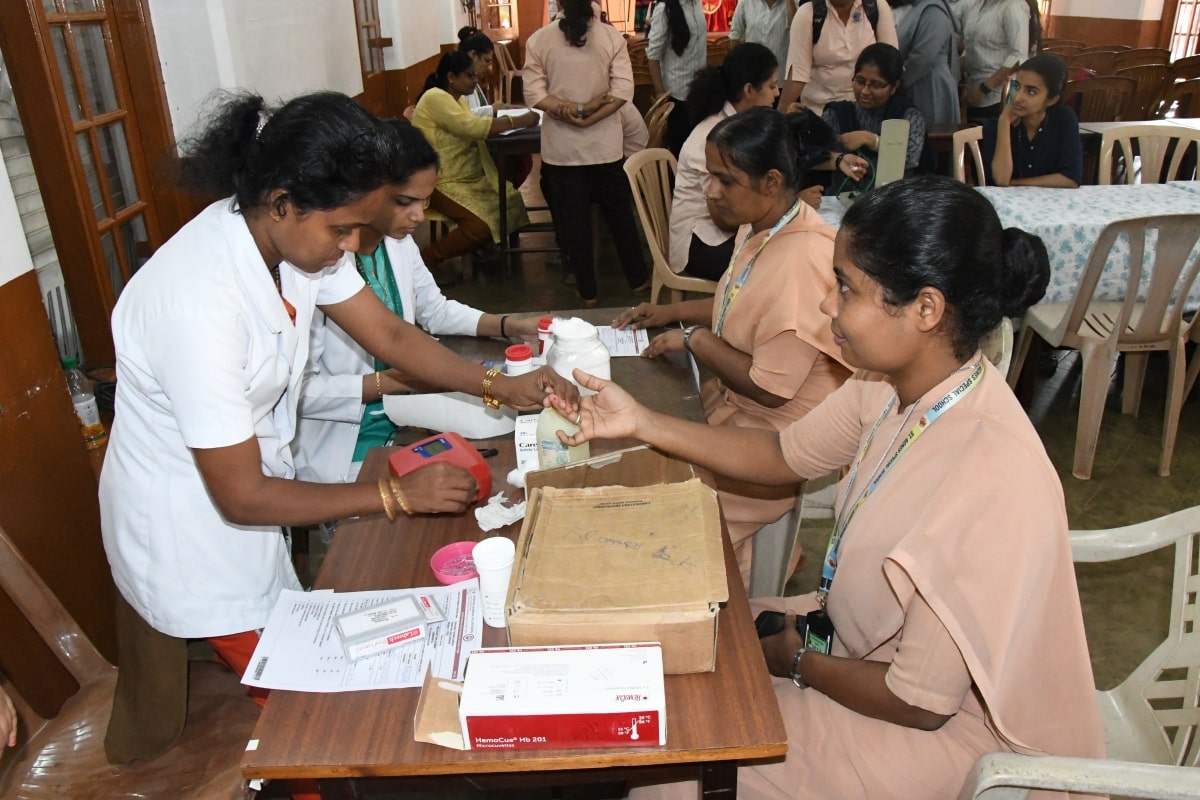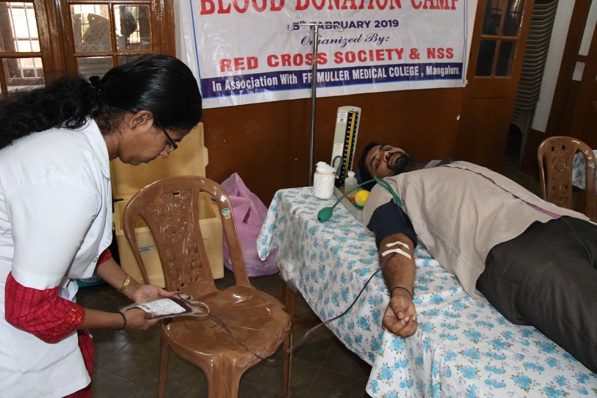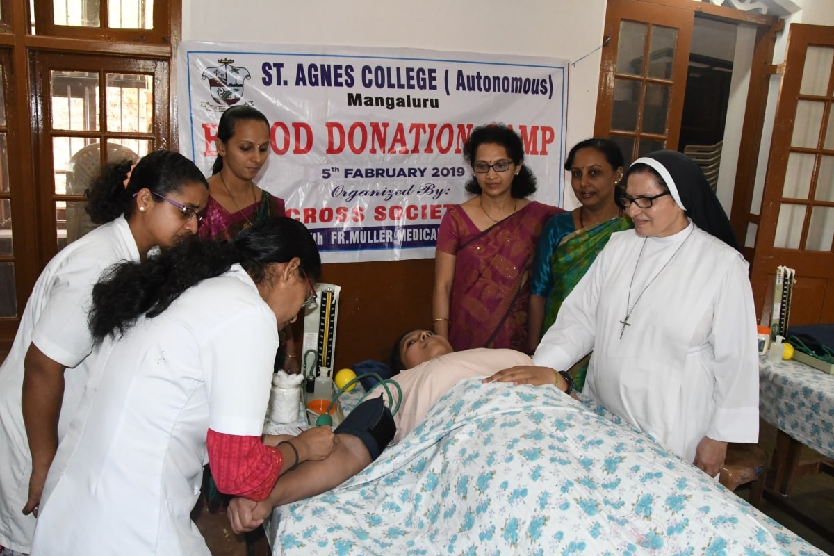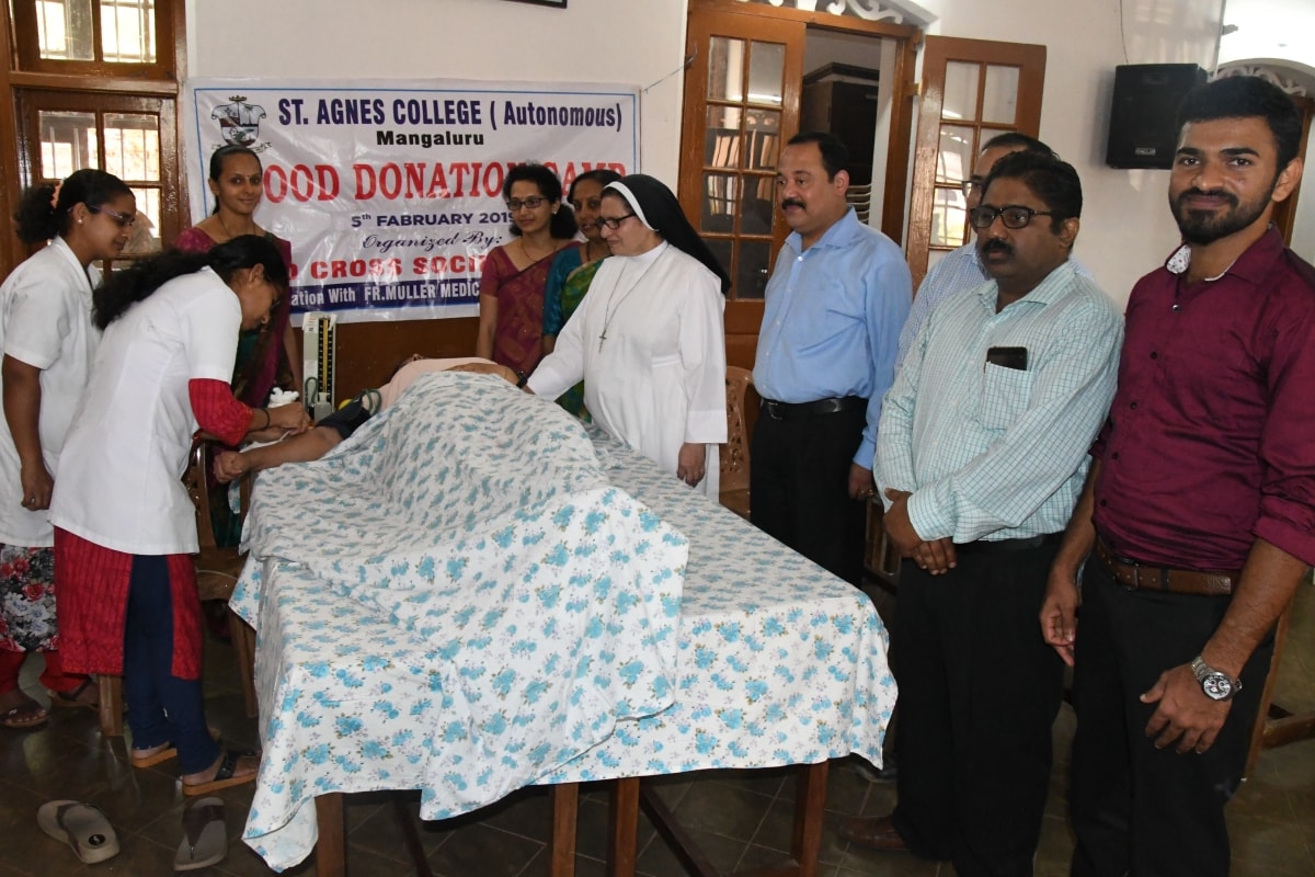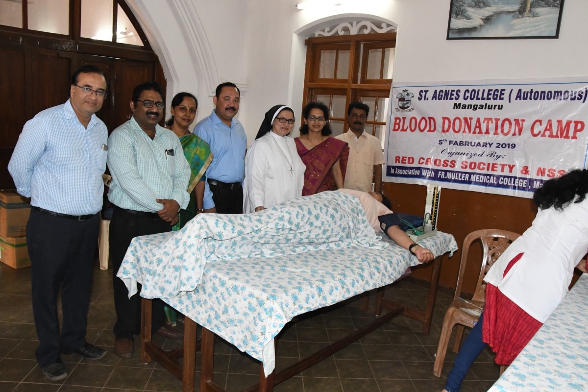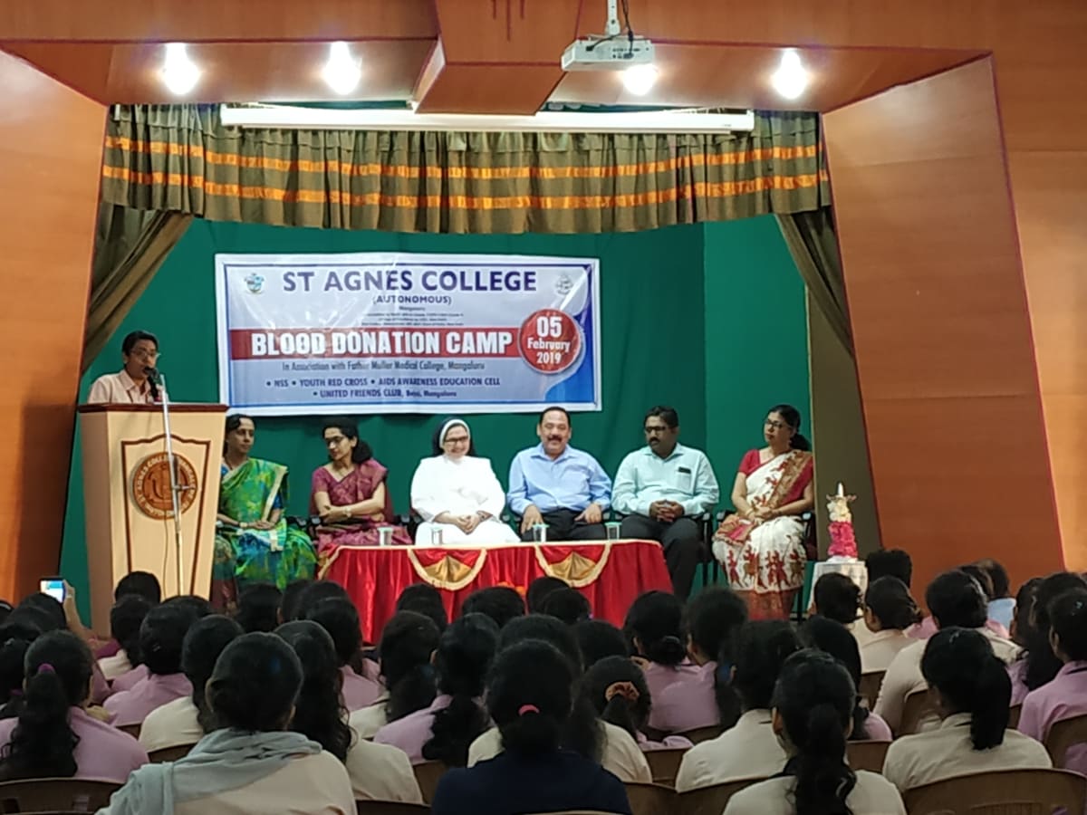 The Youth Red Cross, Aids Awareness Education Cell and NSS Units of St Agnes College(Autonomous), Mangaluru in association with Father Muller Medical College, Mangaluru and The United Friends Club, Bejai, Mangaluru organised a one day Blood Donation Camp on 05 February 2019. The Chief Guest of the programme Sr Dr M. Jeswina A.C., Principal, St Agnes College motivated the students to donate blood and declared the camp open. Dr Kirana Pailoor, Blood Bank Officer, Father Muller Medical College, Mangaluru addressed the gathering on the importance of Blood Donation. Mr. Nirmal DSouza, President of United Friends Club enlightened the students on the importance of social service activities among the youth. Mr Lesly Gomes, convenor, Blood Donation Camp, United Friends Club, Mrs Prajwal Rao, Staff Coordinator of YRC, Mrs Anitha S, Mrs Helen Serrao, Mr Derik, Ms Seema staff coordinators of NSS were among the other dignitaries present. Ms Jasmine welcomed the gathering and Ms Renee Johnson proposed the vote of thanks. NSS volunteer Ms Nerissa Noronha compered the programme. 105 pints of blood was donated.
