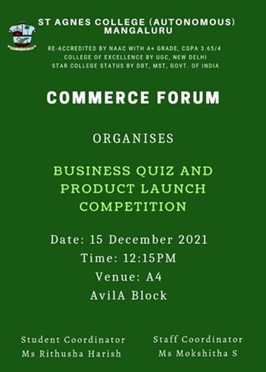 The Commerce Forum, St Agnes College (Autonomous), Mangaluru organized business quiz and product launch competitions on 15 December 2021. 17 students actively took part in each of the competitions.