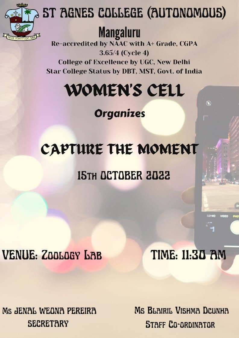 Capture the moment – A mobile photography competition was organized by Women’s Cell, St Agnes College (Autonomous), Mangaluru on 15 October 2022 on the topic “Agnesian essence”. The students were asked to go around the campus and capture the best moments in the campus pertaining to the theme given. The students took active part in the competition.
