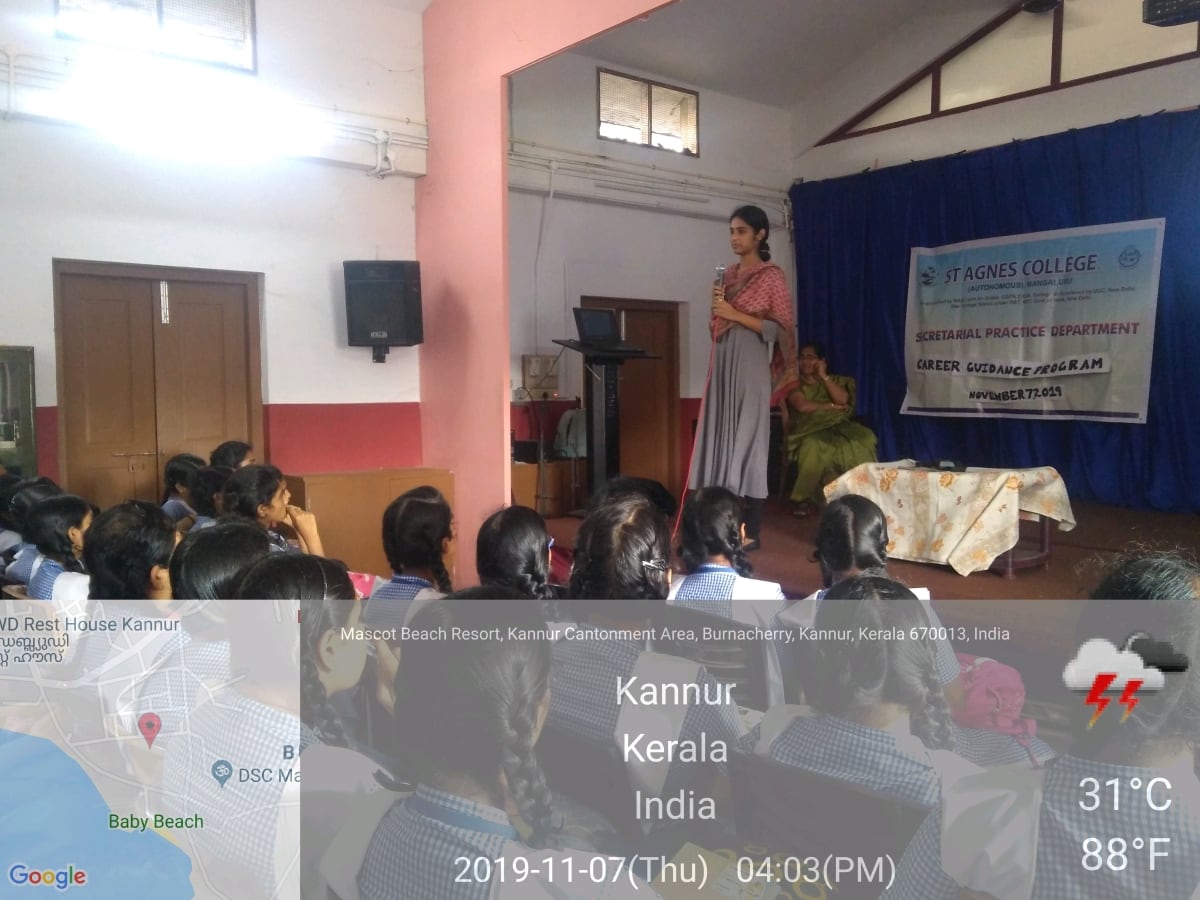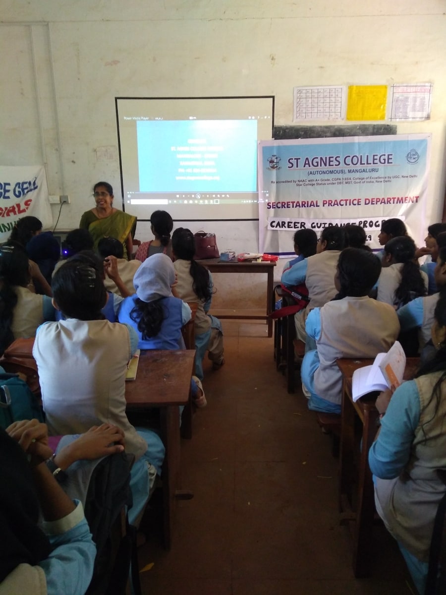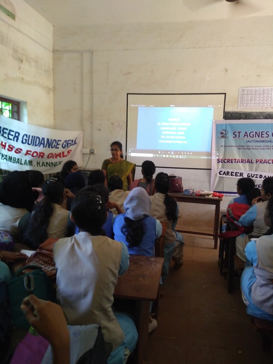The staff and students of the dept. of Secretarial Practice, St. Agnes College, conducted Career guidance programmes at three Plus two (PU) colleges in Kannur. The colleges were, Government Vocational Higher Secondary School, Kendriya Vidyalaya and St. Theresa School. The team presented the various options available for higher studies and the relevant jobs opportunities on completion of degrees in Arts, Science, BCA, BBA and Commerce to the PU students. This was done with special reference to the Arts programmes as per the request of the Principals of these colleges.