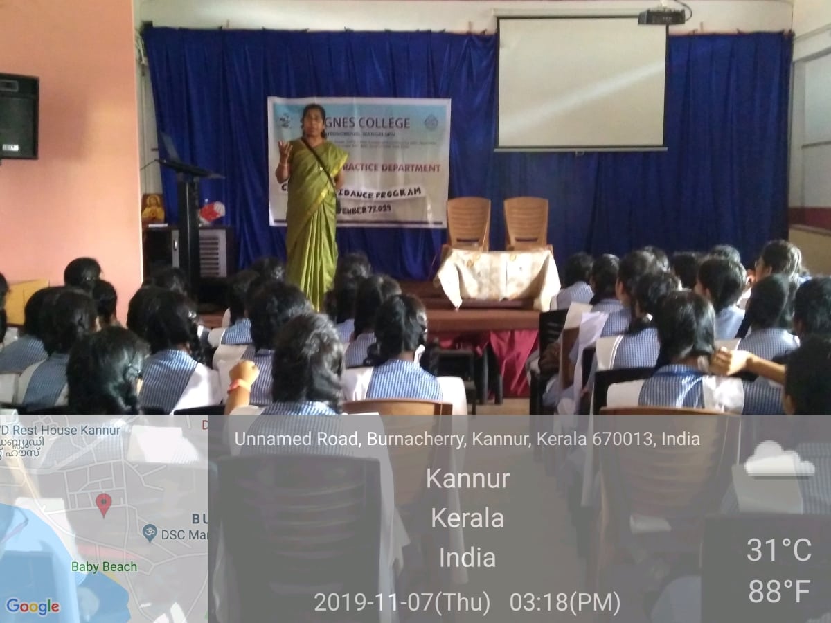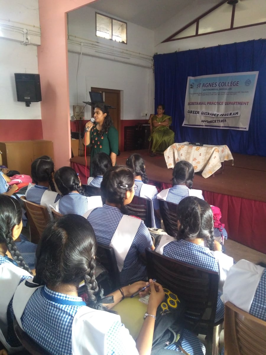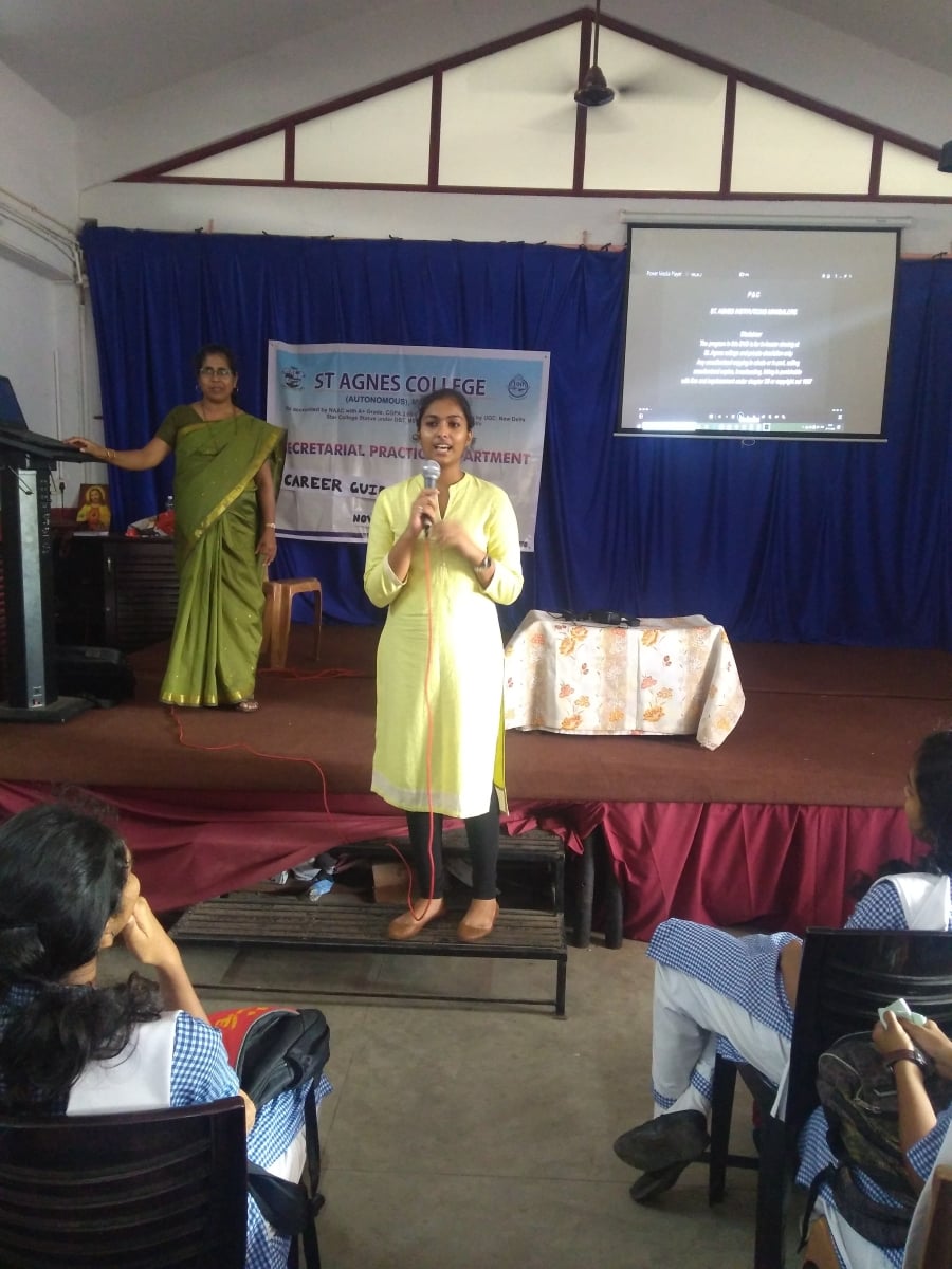 The staff and students of the dept. of Secretarial Practice, St. Agnes College, conducted Career guidance programmes at three Plus two (PU) colleges in Kannur. The colleges were, Government Vocational Higher Secondary School, Kendriya Vidyalaya and St. Theresa School. The team presented the various options available for higher studies and the relevant jobs opportunities on completion of degrees in Arts, Science, BCA, BBA and Commerce to the PU students. This was done with special reference to the Arts programmes as per the request of the Principals of these colleges.