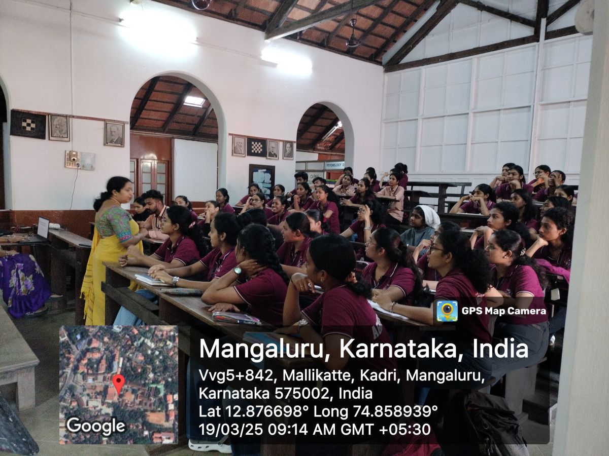 St Agnes College (Autonomous) department of Psychology organized a talk on Career options in Psychology, 26 March 2025 by Dr Kavyashree, Dean of PG studies, Ms Rosita, Asst Prof. Clinical Psychology and Ms Avanthika, Student from Centre for Post Graduate Studies and Research was an informative session where students were given guidance regarding the different options available for them in Psychology. They were oriented with regard to selection of courses, colleges and career options.