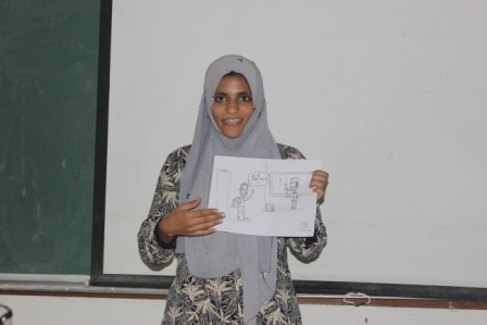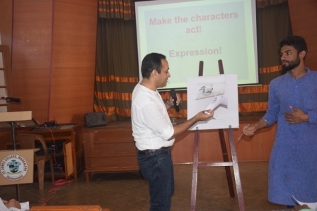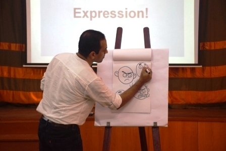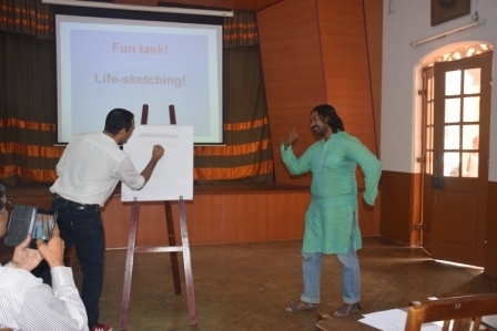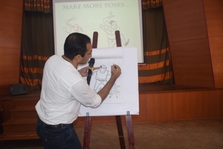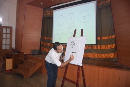 Acharya introduced various cartoon drawing techniques, demonstrated on drawing live caricatures. He also conducted activities by dividing participants into groups and asked them to draw a cartoon on the present political scenario. The winners were awarded with the Cartoon Books by Acharya.