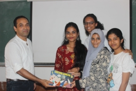 Satish Acharya was felicitated by Ms Deekshitha Prashanth Assistant Professor Department of Journalism and Cartoon Workshop convener. Ms Nandini III Year student compered the programme and Ms Nancy Student Convenor gave the vote of thanks.
