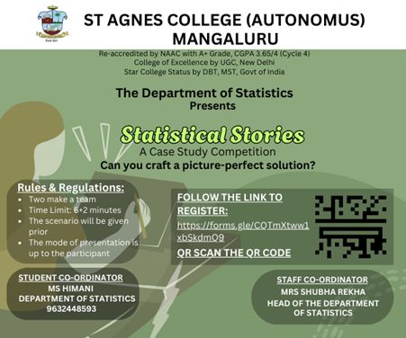 The Department of Statistics of St. Agnes College organized a case Study -Statistical Stories Competition- Practical Session on the analysis of Research data using EXCEL specially focusing on Descriptive Analysis and Data Visualization techniques for the final year B Sc students on 29th of August 2024. Students got exposed to methods and techniques that can be applied to handle research data efficiently and effectively.