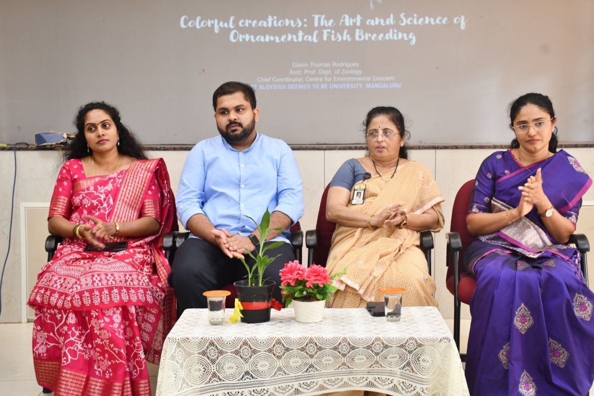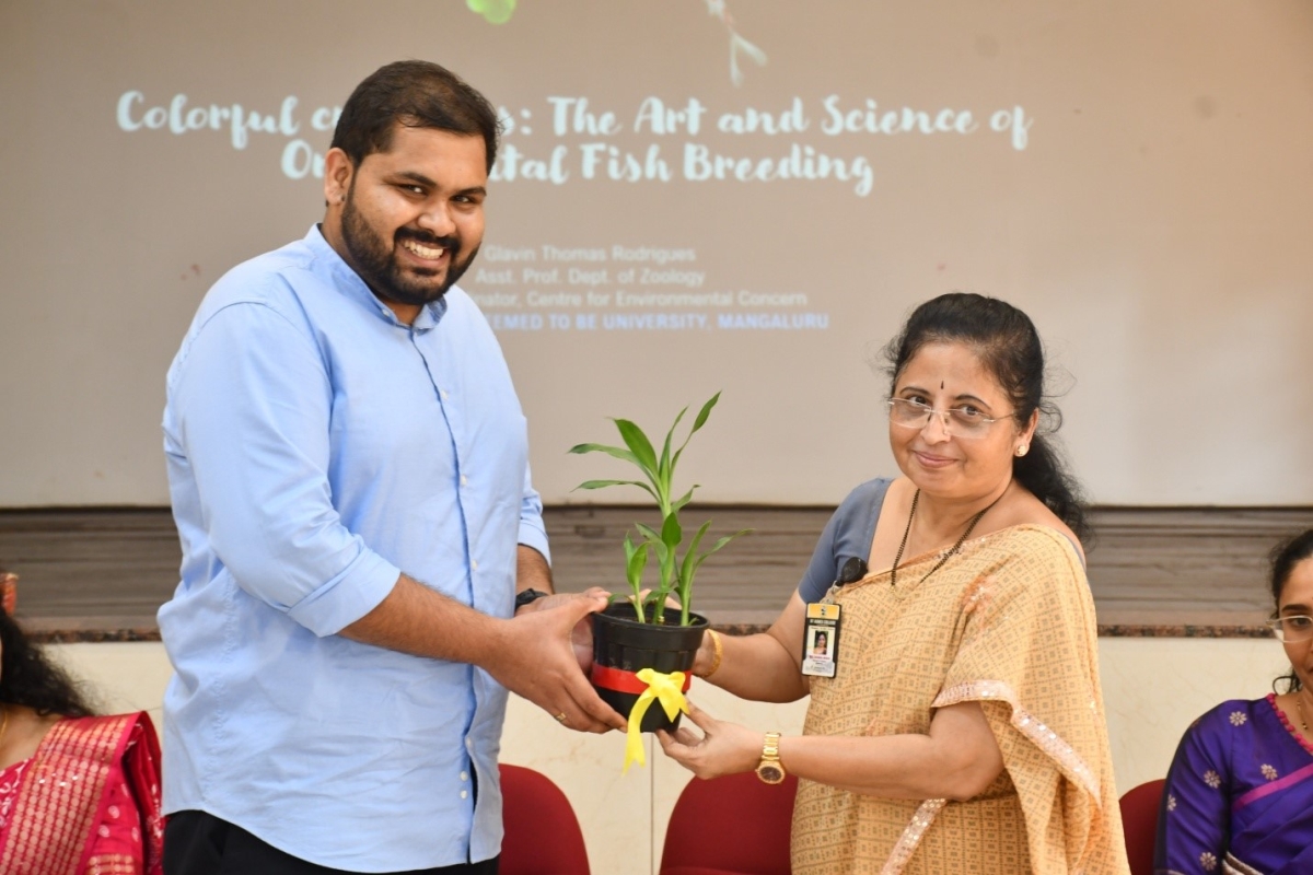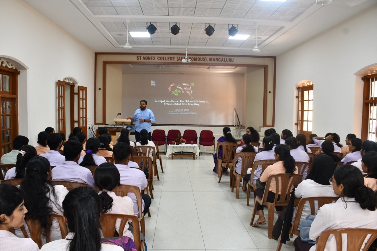 The Department of Zoology at St. Agnes College (Autonomous), Mangalore, organized an enlightening session titled “Colorful Creations: The Art and Science of Ornamental Fish Breeding” on January 30, 2025. The session was conducted by Glavin Thomas Rodrigues, Assistant Professor from the Department of Zoology, St. Aloysius (Deemed to be University), Mangalore. His expertise and engaging approach made the session both educational and enjoyable.