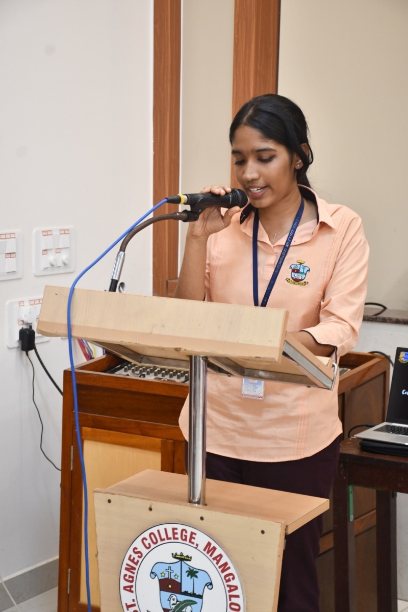 The event was honored by the presence of Mrs. Shubharekha, Registrar of St. Agnes College (Autonomous), along with Dr. Rachana L. Alva, Head of the Department of Zoology and Dr. Navya H, Assistant Professor in the Department of Zoology. The session began with the host, Ms. Uzma, extending a warm welcome to the esteemed guests and participants. This was followed by a prayer by Ms. Sushmitha Hegde and a heartfelt welcome address delivered by Ms. Sinchana Saraswathi. Ms. Hrithika Sunil then introduced the distinguished guest. The event concluded with a vote of thanks expressed by Ms. Akshatha Seth.