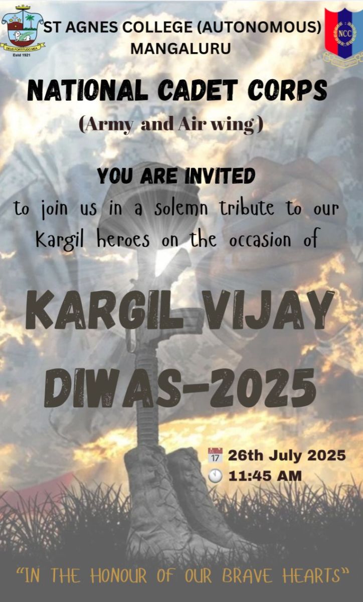 On 26th July 2025, NCC Army and Air Wing jointly organized a commemorative event to honor Kargil Vijay Diwas, celebrating the valor and sacrifice of our soldiers in the Kargil conflict. The significance of the day was highlighted, emphasizing the bravery and patriotism displayed by our armed forces during the 1999 Kargil war.