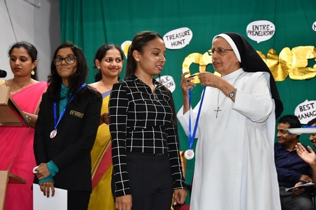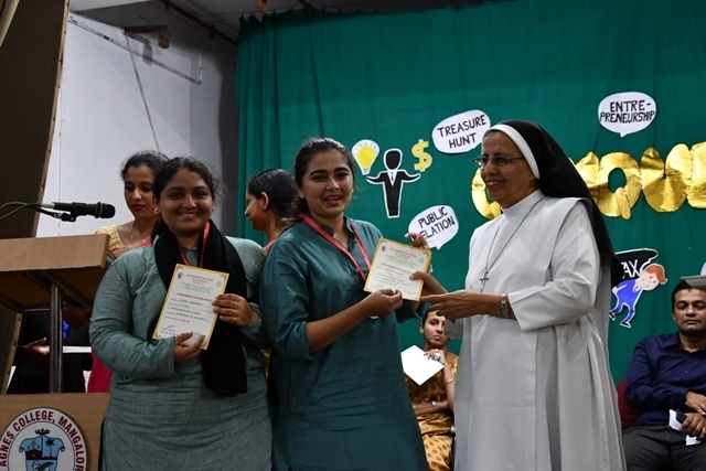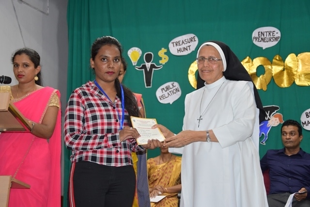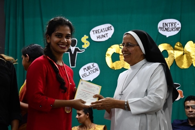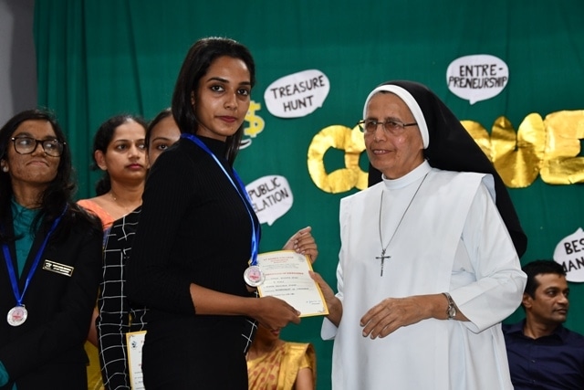 The INTRA Collegiate fest was concluded with a valedictory ceremony. Sr. M. Carmel Rita A.C., the Administrator of the college, was the Chief Guest. In her address, she said the motivation must come from within and encouraged the students to participate. Ms. Dalia D’Souza, Mr. Delan Lobo and Mr. Rodney Vaz the Faculty of Commerce, announced the prize winners and Sr. M. Carmel Rita A.C, gave away the prizes. Ainish D’Cunha compered the valedictory and Sheryl D’Souza of III B.Com proposed the vote of thanks.