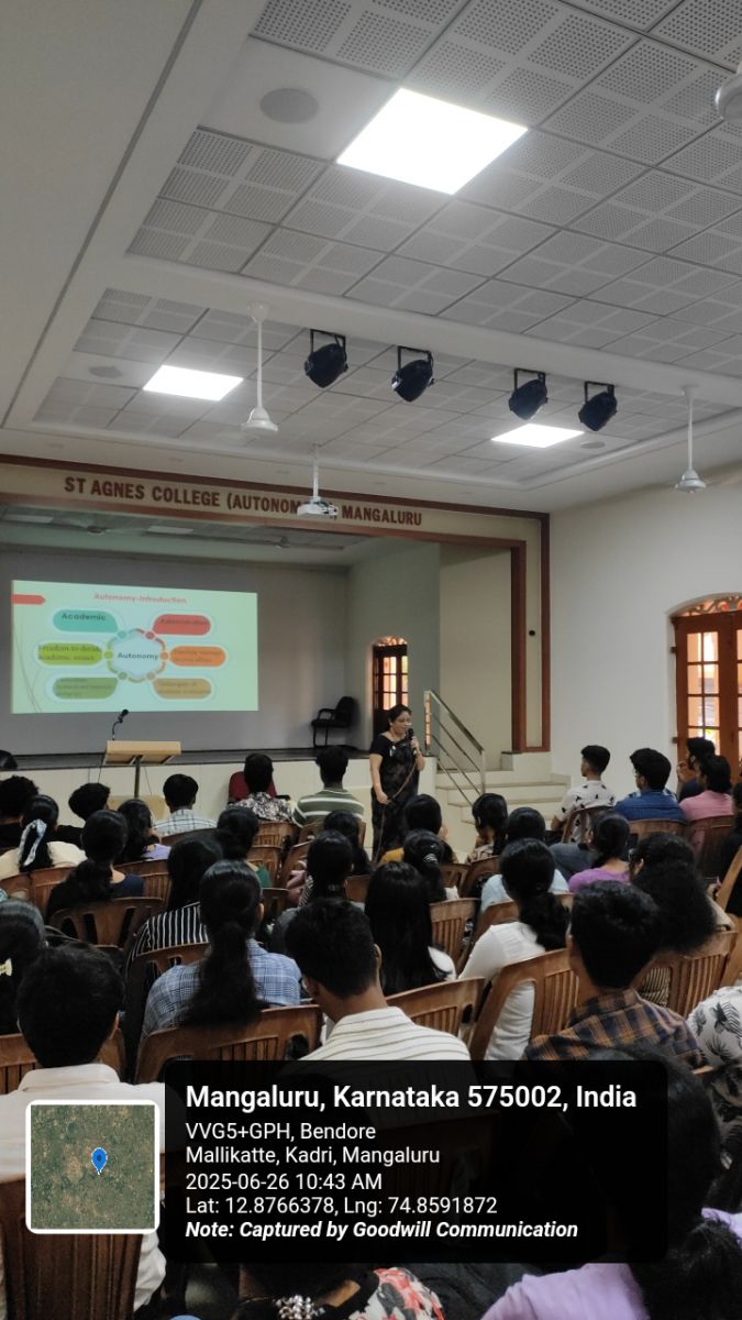 The Induction Programme at St Agnes College (Autonomous), Mangaluru was thoughtfully designed to prepare students for academic life while fostering personal growth and a strong sense of community. Each session was aimed at equipping students with essential life skills, promoting emotional well-being, and encouraging inclusive and responsible communication. Through this comprehensive approach, the program empowered students to navigate college life with confidence, clarity, and a sense of purpose. The sessions were well-organized and enthusiastically received by all participants, marking a positive and impactful beginning to their journey at St Agnes College.