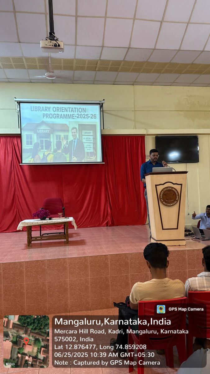 Mr Avil provided an insightful overview of the library’s objectives, services, and resources. He explained the availability and access procedures for the extensive collection of books, journals, newspapers, magazines, and reference materials, along with borrowing rules, loan durations, and the book renewal process. The session also introduced students to the library’s digital services, including computer facilities, e-resources, and the use of the Online Public Access Catalogue (OPAC). In addition, he guided students through MOOC platforms such as SWAYAM and NPTEL, encouraging them to enroll in free online courses for academic and skill enhancement. A live demonstration of the college library portal added a hands-on element to the session, making it both practical and engaging. The orientation was well-received, and students appreciated the clear guidance and motivation to actively use library and online learning resources throughout their academic journey.