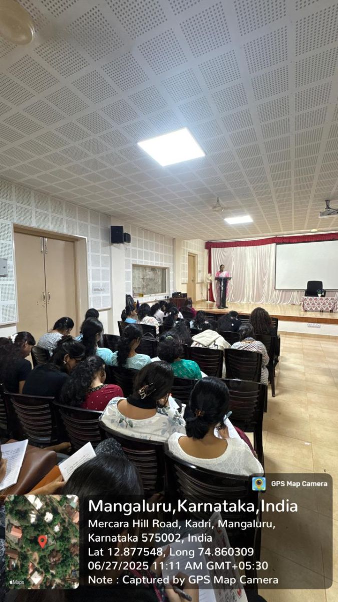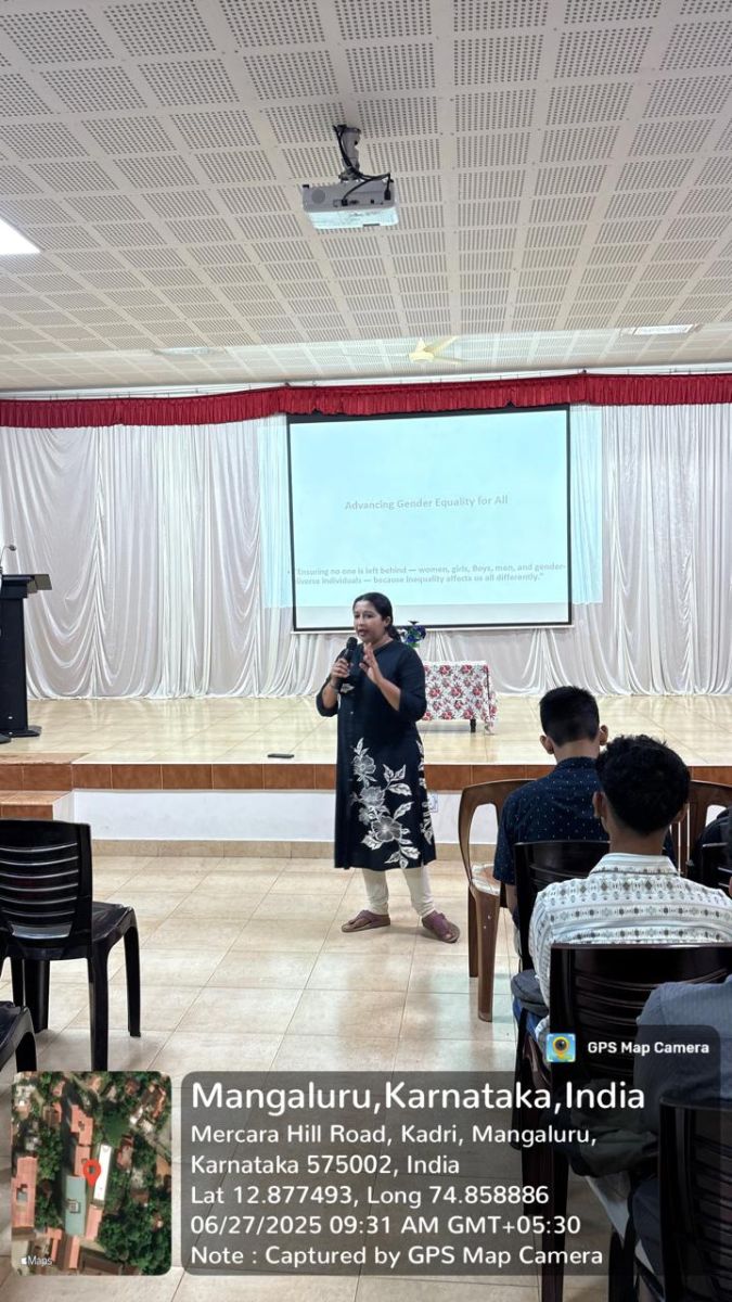 Dr Kavyashree addressed a range of critical issues including gender-based violence, inequality, economic and leadership disparities, and the importance of Sustainable Development Goals. She also clarified the distinction between sex and gender, emphasizing that gender is a social construct influenced by societal norms. Her session highlighted the need for inclusive language, mindset change, and structural equity, stressing that true gender equity lies in ensuring fair and just opportunities for all individuals, regardless of gender. The talk was both empowering and thought-provoking, inspiring students to reflect on their own beliefs and take active roles in promoting equality.