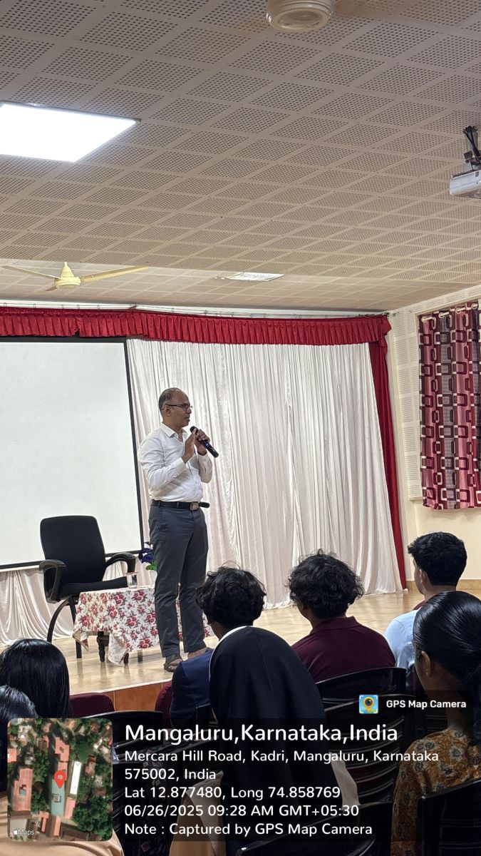 Prof. Gerard Dsouza delivered a heartfelt talk emphasizing the importance of optimism, practical wisdom, and integrity over mere academic performance.He shared a memorable and thought-provoking formula for success: