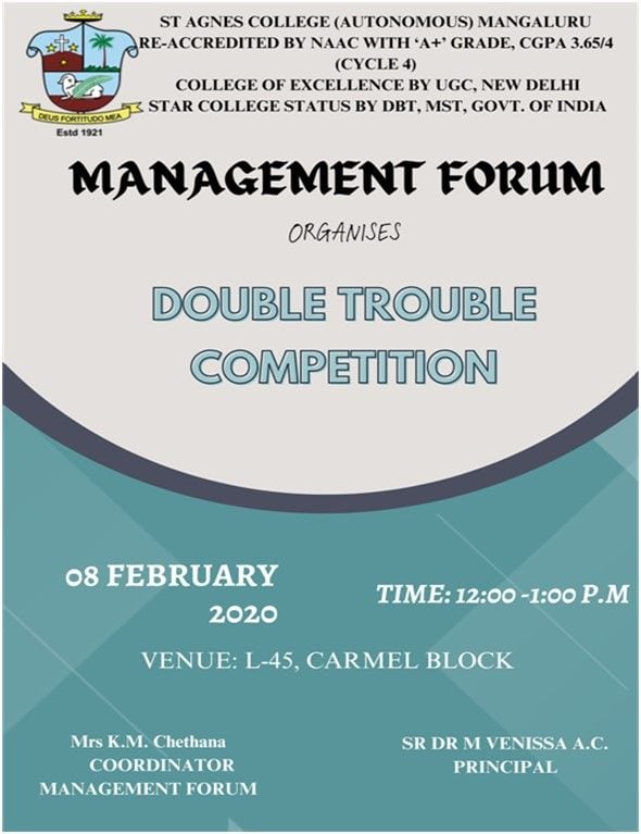 The Management forum, St Agnes College (Autonomous), Mangaluru organized a competition on the topic “Double Trouble” on 8 February 2020. Students were divided into teams of two and were given Rs. 20, by which they had to buy a product and sell it at double the amount. The students learned the art of selling the product and made profit. 51 students participated in the competition.
