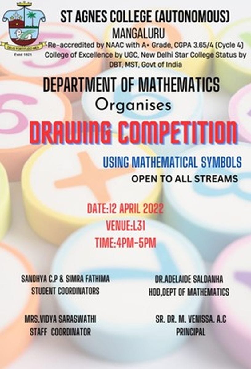 The Department of Mathematics, St Agnes College (Autonomous), Mangaluru conducted a drawing competition on 12 April 2022 using mathematical symbols. This competition was open to all the students of all streams. Students had to use different mathematical symbols to draw any picture. The students could use their own creativity and ideas to draw mathematical symbols. The drawing was judged based on the creativity, neatness, usage of symbols and overall performance.