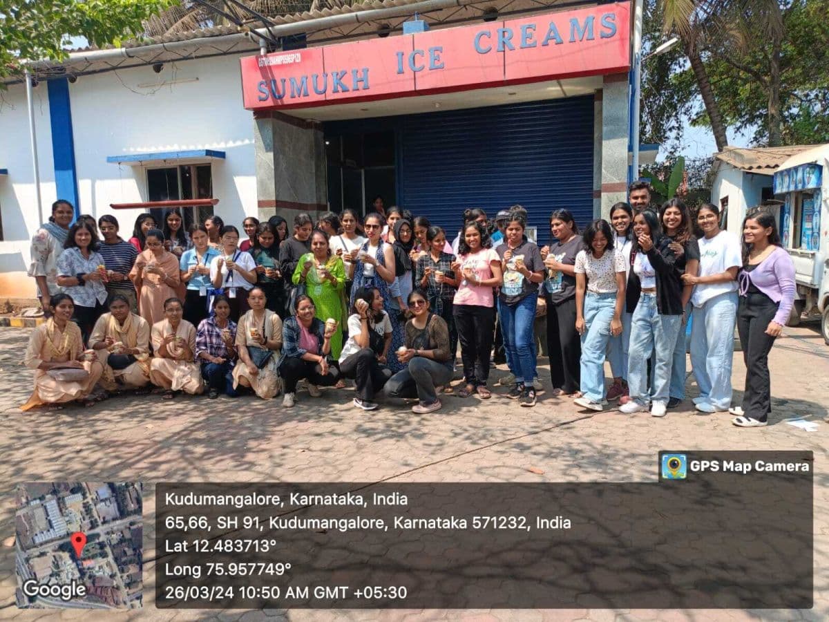 The visit commenced with a comprehensive tour of Sumukh Ice Cream Factory, Kushalnagar. Students gained insights into the intricacies of ice cream manufacturing witnessing the entire process firsthand. They indulged in a delightful tasting session, sampling various flavors. The highlight was stepping into the cold storage room, set at an astonishing -33°C, where they observed the meticulous preservation of ice creams.