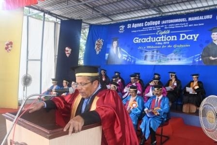 The Eighth Graduation Day of St Agnes College (Autonomous) was held on Saturday, 4 May 2019, on the College Grounds with all the spiritedness that the occasion demanded. The programme commenced at 3.00 p.m. with a ceremonial march from the NAAC room, Avila Block, to the venue immediately followed by the invocation in the form of Nadageethe. Among the dignitaries present were, the esteemed Chief Guest Dr N.Vinaya Hegde Hon’ble Chancellor, Nitte (Deemed to be University), The President of the programme, Sr Dr Maria Roopa A.C.( Joint Secretary St Agnes College,the members of the Governing Body and the Academic Council,The Registrar, The IQAC Co-ordinator, the Deans of all the faculties, the members of the various Boards of studies and Boards of Examiners,Members of PTA, PG Co-ordinator, also joined the ceremonial march. The Alumni and the parents of the graduates were among the special invitees for the ceremony. Dr Ita D’souza welcomed the gathering and introduced the Chief guest and soon after the Principal of St. Agnes College administered the Oath to the fresh graduates and thereafter the President of the programme declared the Graduation Day open and the Registrar ,St Agnes College (Autonomous) Mr. Charles Pais presented the graduates to the President. There were 680 graduates in all, 600 undergraduates and 80 Postgraduates including16 rank holders who received ranks with medals and cash prizes.