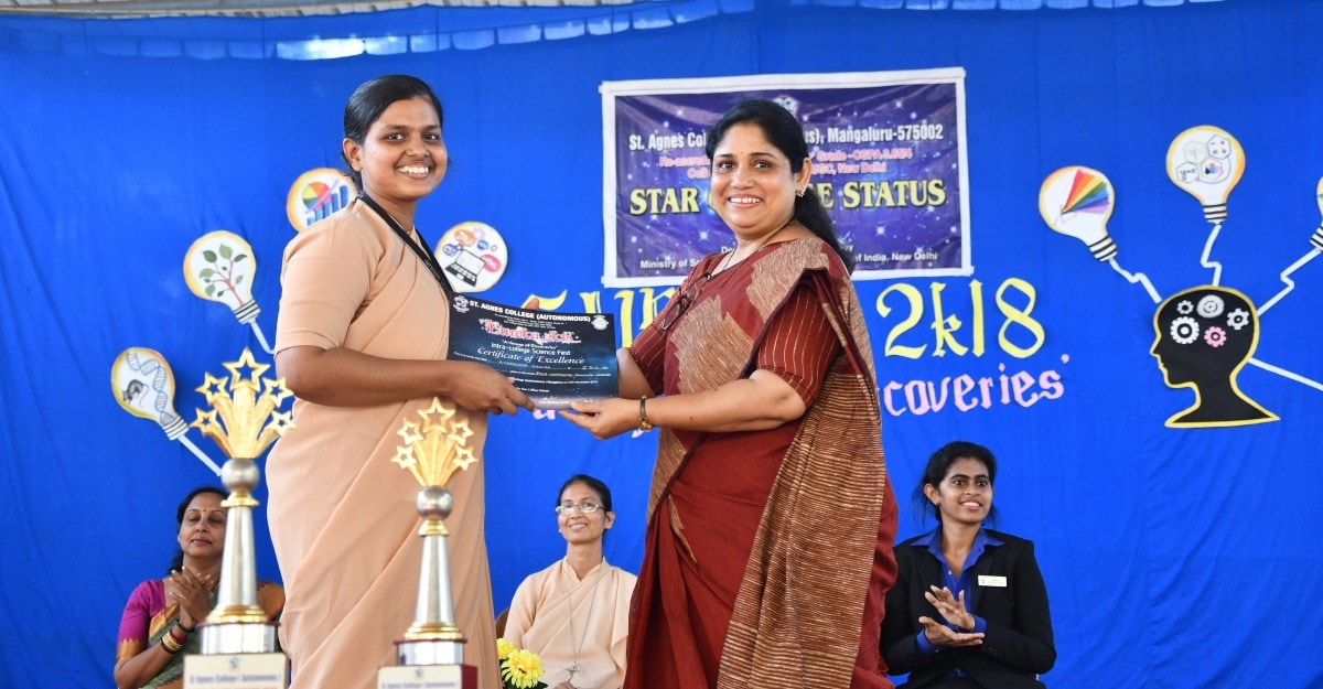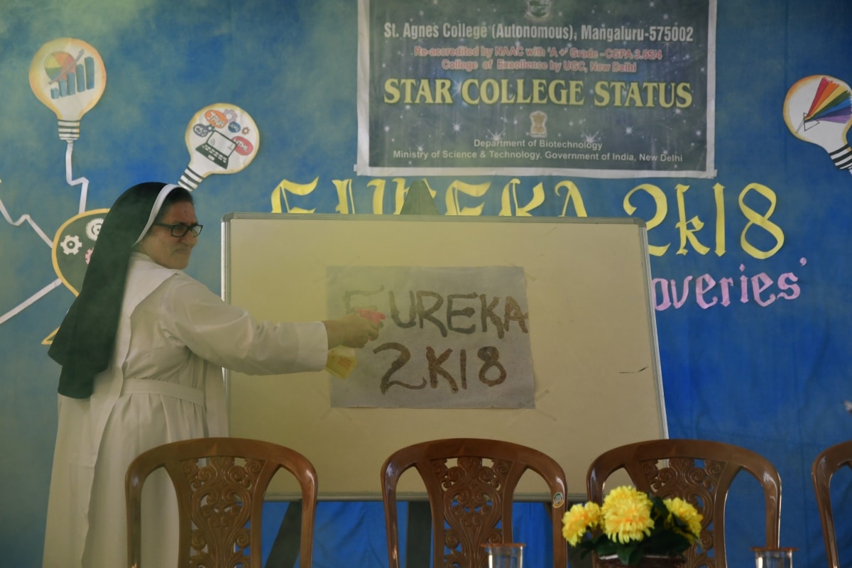 The Science departments of St Agnes College(Autonomous) ,organised an intra departmental fest “EUREKA 2K18 – A VOYAGE OF DISCOVERIES” under star college scheme on 27th November 2018. The fest was inaugurated by the chief guest Sr Dr M. Jeswina A.C., Principal St Agnes College. Renee Johnson from final year BSc welcomed the gathering. The Principal addressed the gathering and unveiled the trophy. Dr Ita Gonsalves, IQAC Co Ordinator,Mrs Emima David ,Dean of science, Mrs Prajwal Rao ,Staff Co ordinator and all heads of the departments were present. Ashwija,The Vice President of Science introduced the fest.There were 13 events conducted by different departments by the event head with the guidance of the faculty. The programme was compered by Akanksha Jadhav and the vote of thanks was proposed by Mayakshi of III BSc. The students enthusiastically participated in all the events and the over all championship was bagged by II BSc MZC.