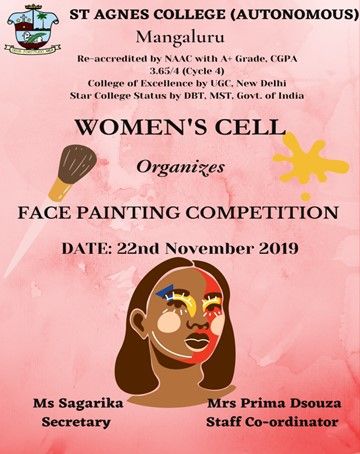 The Women’s Cell, St Agnes College (Autonomous), Mangaluru organized a face painting competition on 22 November 2019. Face Painting competition was conducted for the college students. Seven students participated in this competition.