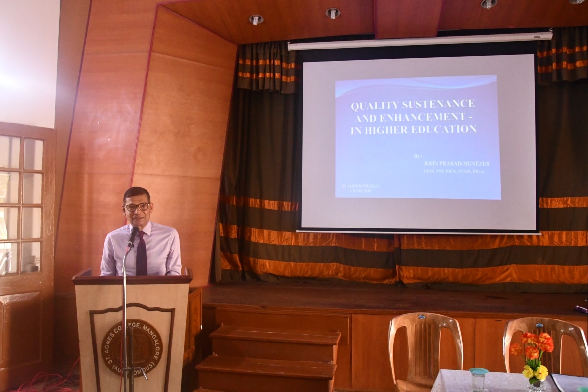 A faculty development programme on the topic Quality, Sustenance and Enhancement in Higher Education was held on 1June 2019.The programme started with the prayer led by the spirituality committee. The resource person was Capt. John Prasad Menezes, LLM, FNI, FICS, FCMS, FICA. He started the session by explaining the three important aspects from the “letter to the Parents in New India” i.e Education system, being good human being and goal of a teacher is two-fold. He asked few questions to the audience i.e. What is Quality? What is Enhancement? And What is Sustenance? Thereafter he emphasised on 5 D’s (Development, Discipline, Devoted, Dedicated and Determination) of quality product, Goodwill of a Brand, Quality education and Behaviour of the stakeholders. He highlighted on the topic “Challenge of Enhancement” which includes the importance of setting up Key Performance Indicators and to make it work. He also said that the education is a dynamic phenomenon and a proper curriculum is essential for quality enhancement in higher education.