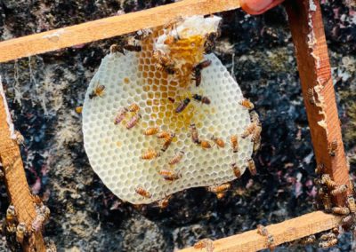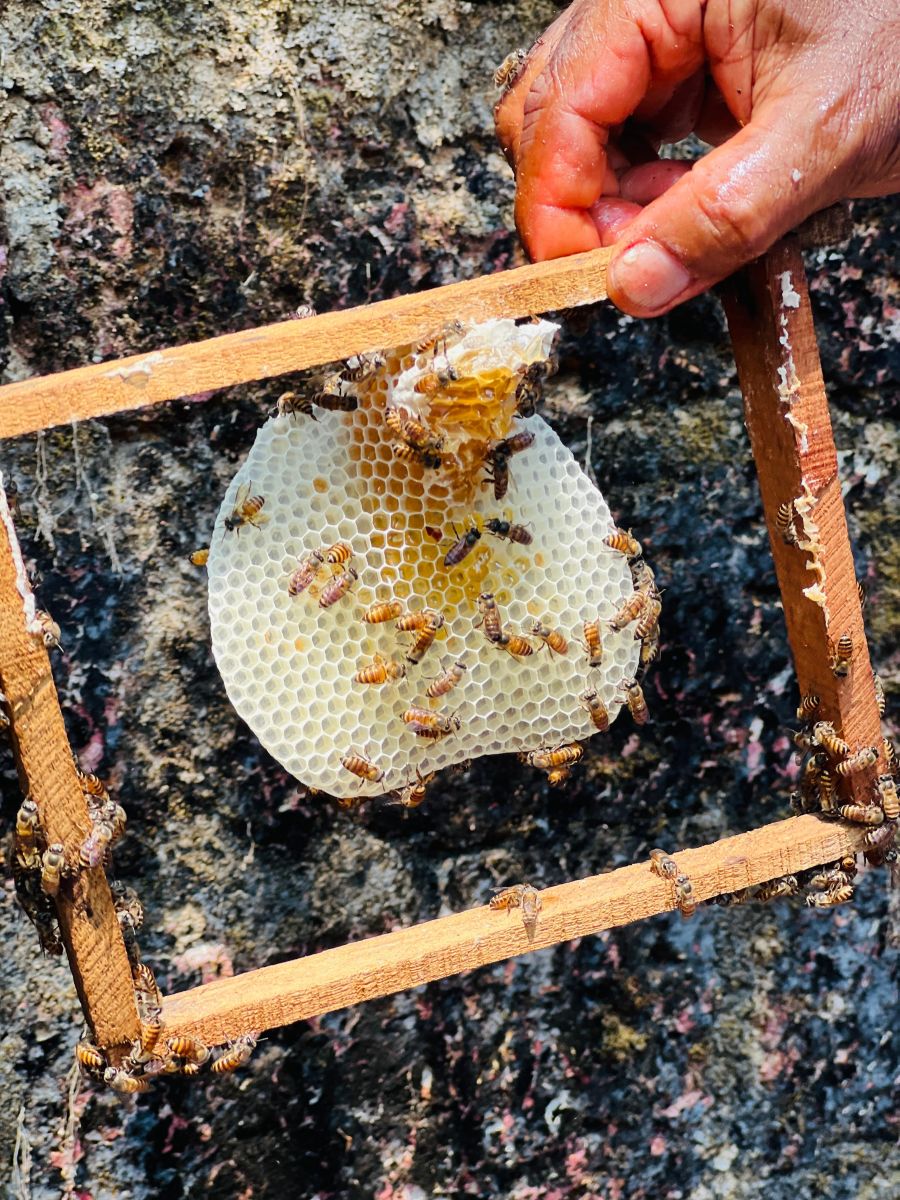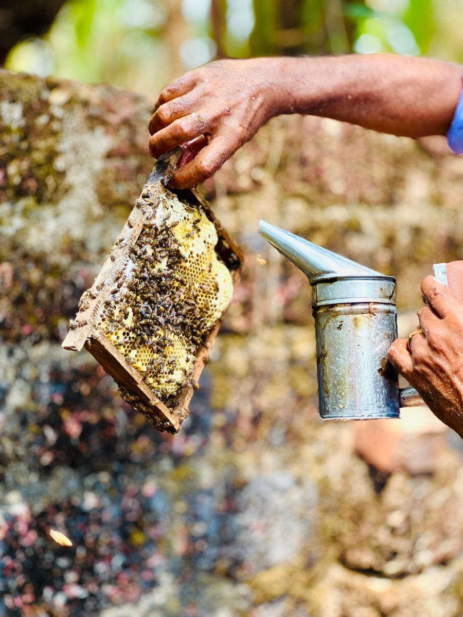Following the visit to the goshala, the group proceeded to an apiculture unit managed by Rajan Padannakad. He is also a skilled resource person associated with College of Agriculture Padannakkad. The apiculture session provided hands-on knowledge about honeybee biology, behavior, and management. Students were introduced to different species of honeybees, their caste system (queen, workers, and drones), and their roles within the colony. Mr. Rajan demonstrated practical aspects such as identifying the queen bee, maintaining hive conditions, seasonal management of colonies, and protecting bees from pests and diseases. A key highlight of the session was the demonstration of honey extraction using modern equipment. Students observed the process of removing honeycombs, centrifugation to extract honey, and filtering techniques to ensure purity.