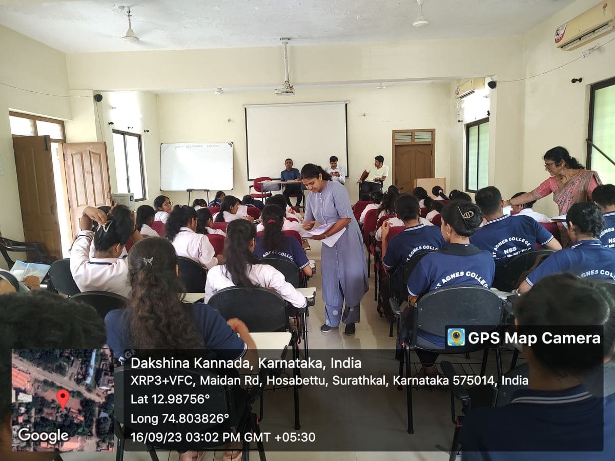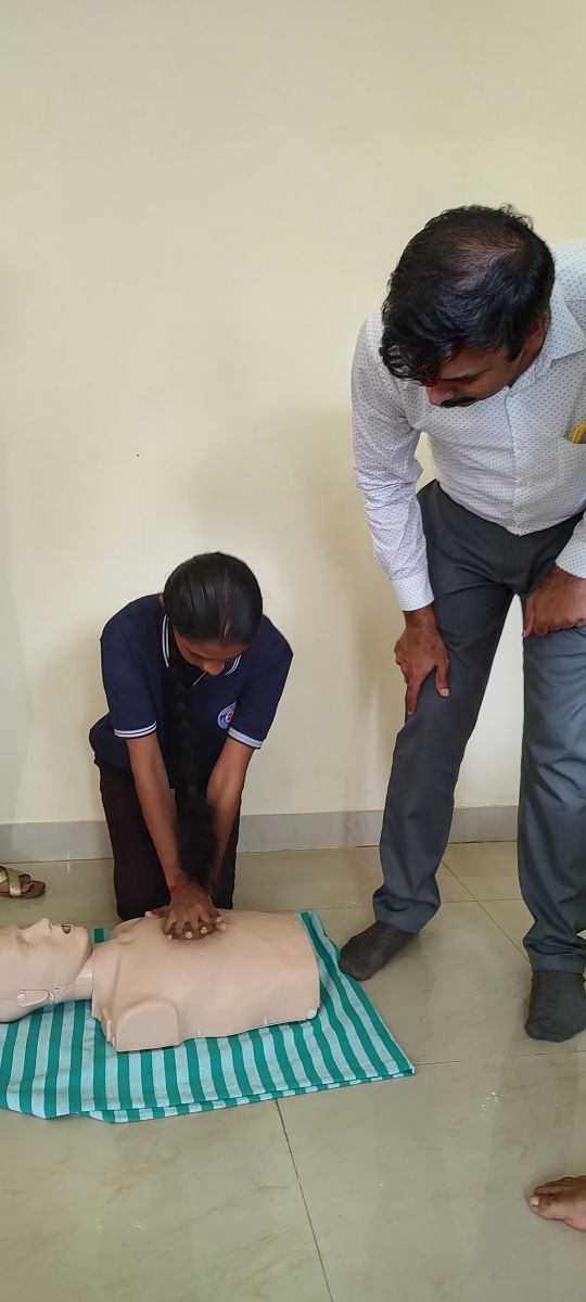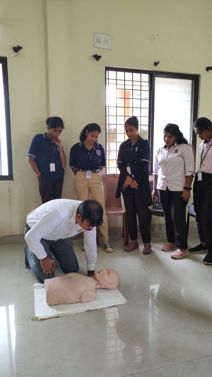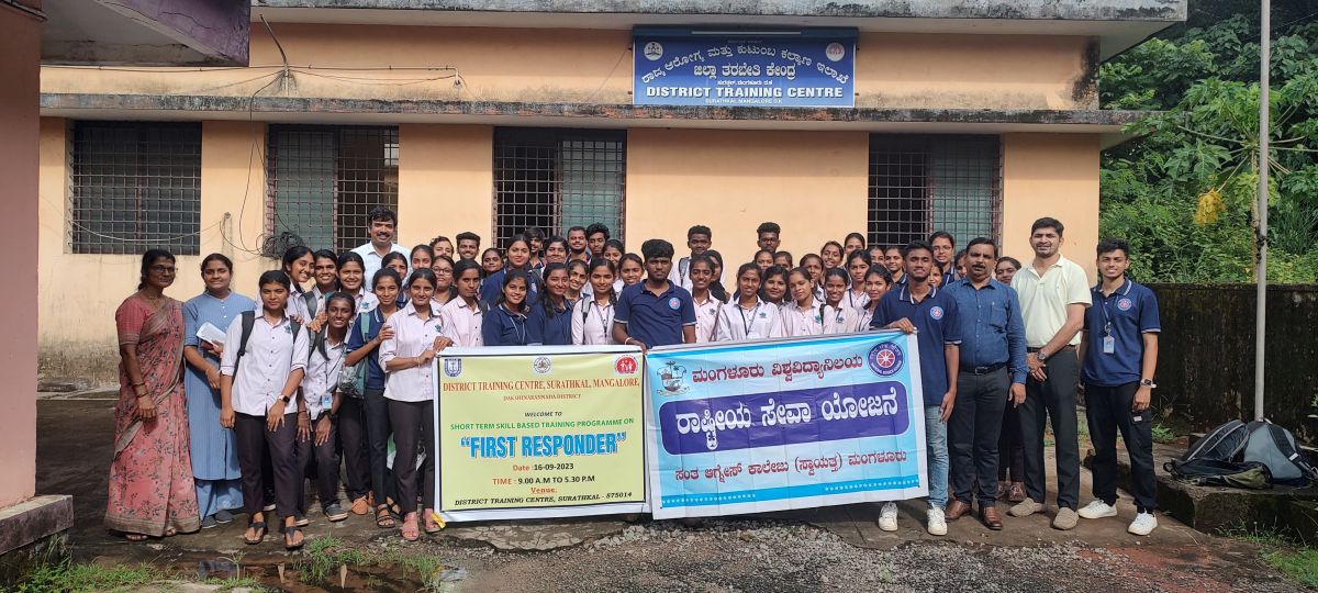 On 16th September 2023, the State Institute of Health and Welfare on Magadi Road, Bangalore, organized a short-term skill-based training program for First Responders at the district training center in Surathkal. Fifty volunteers, along with NSS program officer Dr.Udaya Kumar, participated in the training. The session began with registration and a pretest evaluation. In the morning, participants received information on handling medical emergencies such as fainting and chest pain.