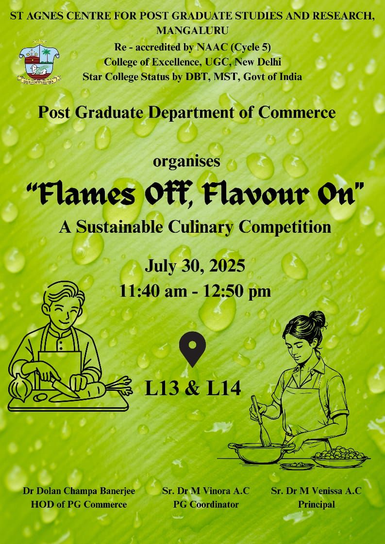 The judges for the competition were Ms Joanna Simon Assistant Professor, Department of English, St Agnes College (Autonomous), Mrs Prima Ferrao Assistant Professor from Department of Nutrition and Mr Roopesh Kumar Assistant Professor from Department of MBA. The dishes were judge based on innovative presentation, unique flavour, variety, cleanliness and nutritional value. The competition witnessed a wide variety of innovative recipes including desserts, smoothies, salads, and many savoury items. The event not only promoted green cooking but also highlighted the importance of sustainable living.