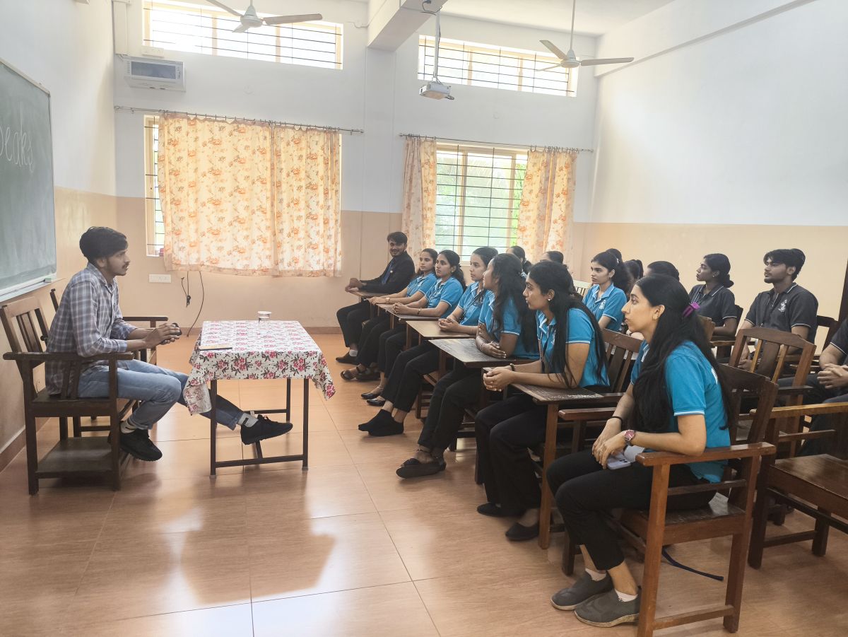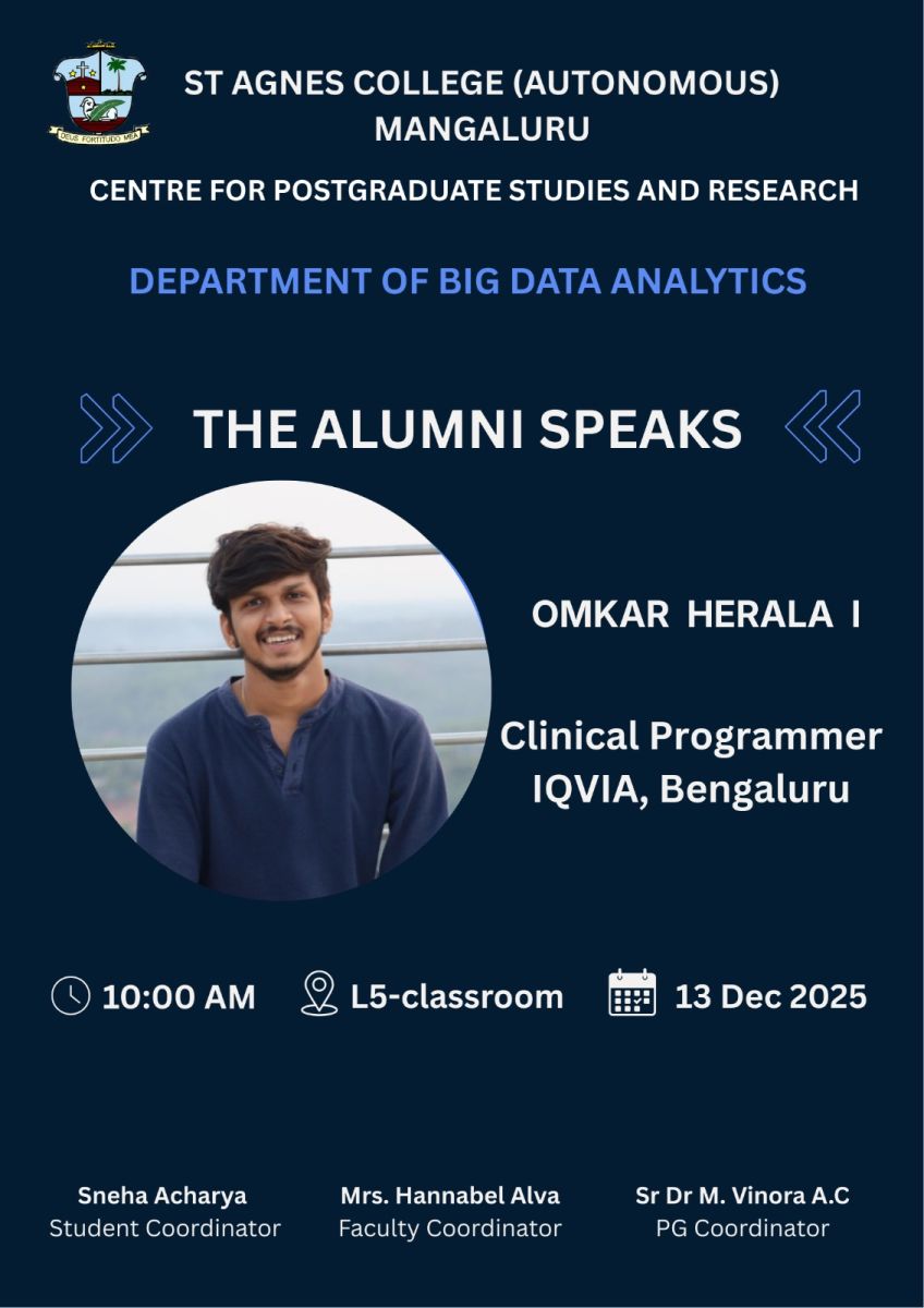 The Postgraduate department of Big Data Analytics organised an Alumni Interaction on 13 December 2025 with Omkar Herala I, who is employed as a Clinical Programmer at IQVIA, Bengaluru. The session aimed at guiding the students in career opportunities and placement preparation. The session began with a welcome and introduction of Omkar. Omkar, an alumni of the Big Data Analytics department highlighted the placement prospects in Data Analytics and outlined the different industry roles open to graduates of the Data Analytics programme. He also spoke about his preparation for placements and the skills needed to succeed in interviews.