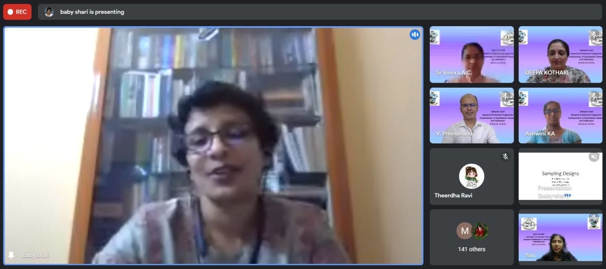 Dr Baby Shari began her session on Sampling Design by focusing on a definite plan for obtaining a sample from a given population. The session included various topics of sampling design like principles of sampling, sampling error, methods of sampling etc. The speaker also clarified the queries of the participants.
