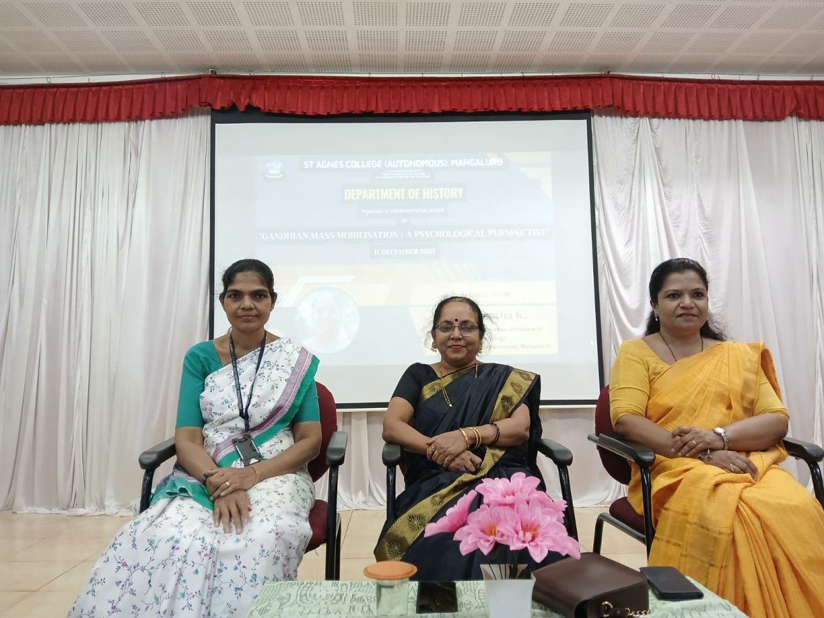 The Department of History organised a Commemorative session entitled “Gandhian Mass mobilization: Psychological Perspective” on11 December 2025. Mrs Vinatha K. Former Associate Professor and HOD of Psychology St Agnes College (Autonomous) was the resource person for the session. Mrs Vinatha K. delivered an engaging and informative lecture that correlated the field of Psychology with history. The session began with a brief introduction to the concept of Mass mobilization, as a Psychological tool used by leaders to organise mass movements, the session provided valuable insights into Psychological interpretation on Historical narratives and offered students a deeper appreciation for interdisciplinary approach.