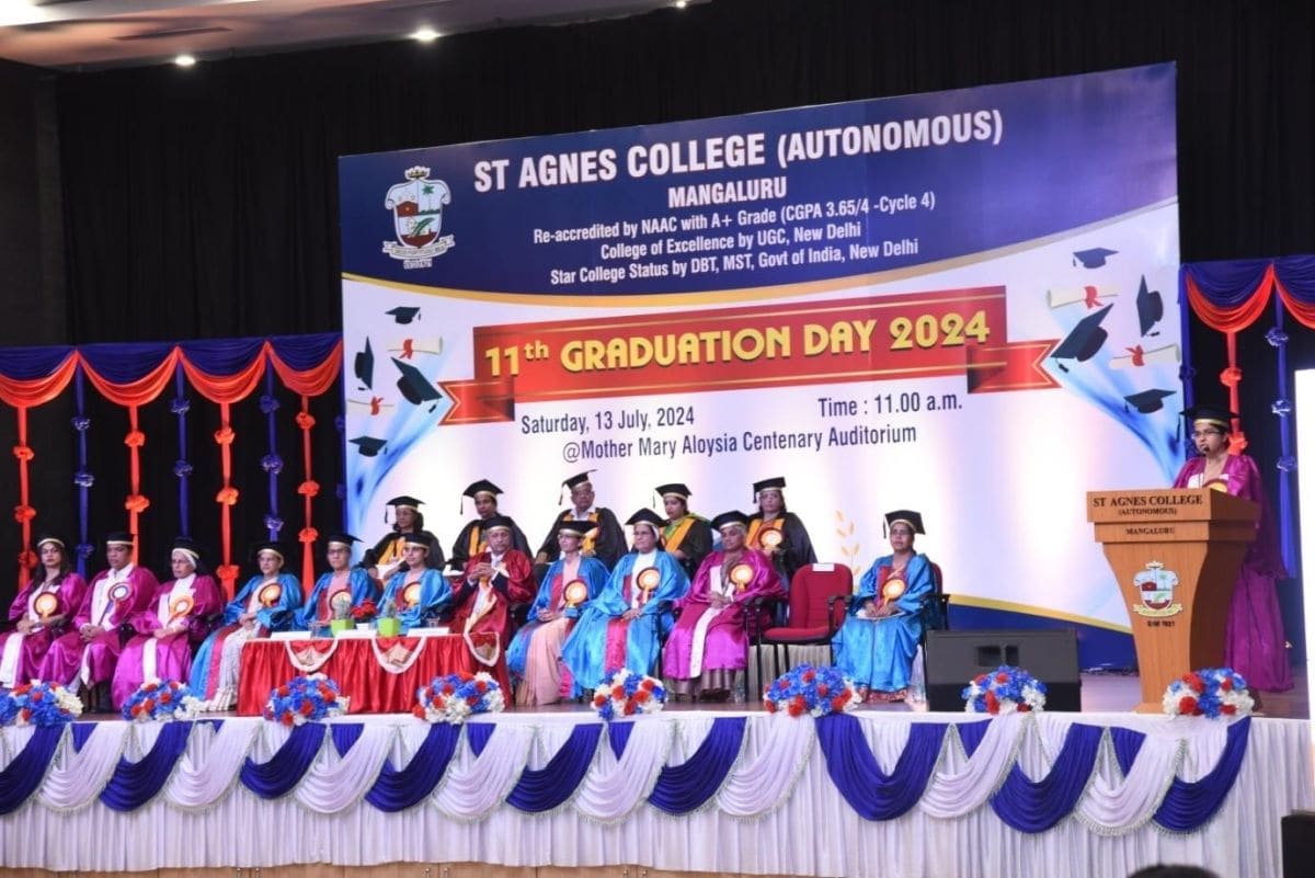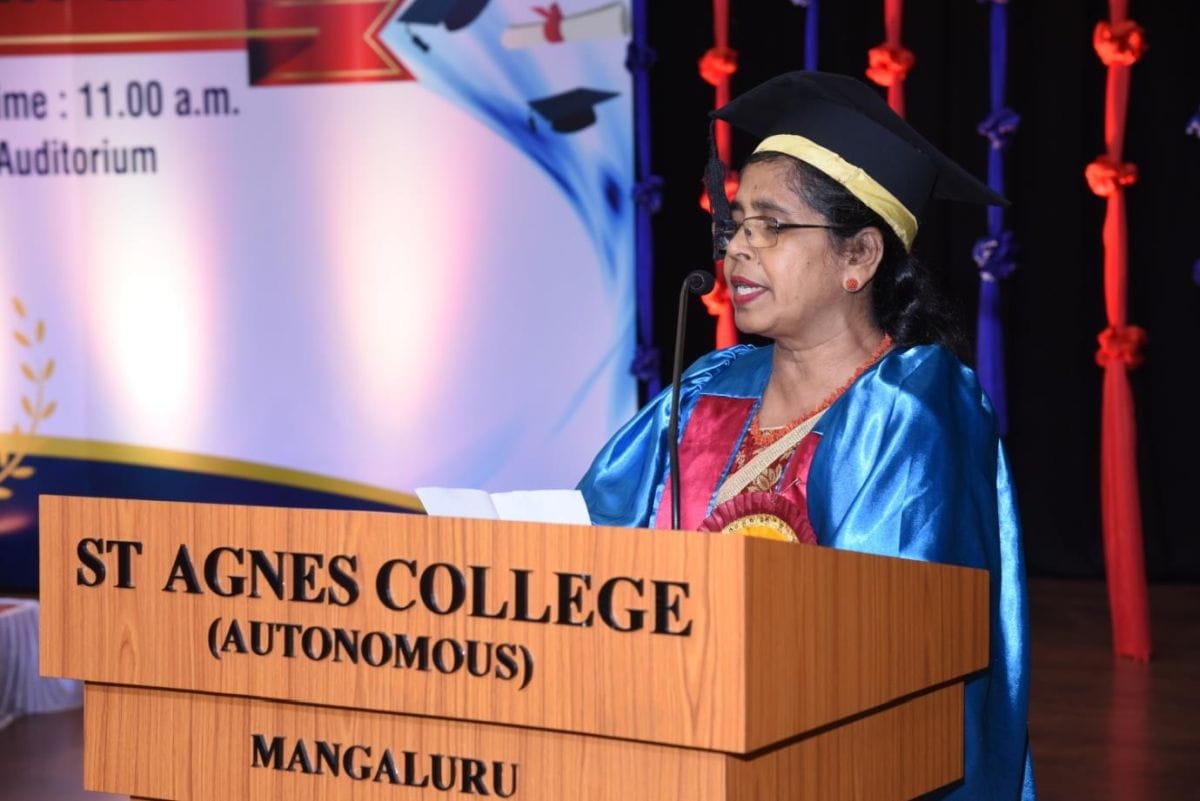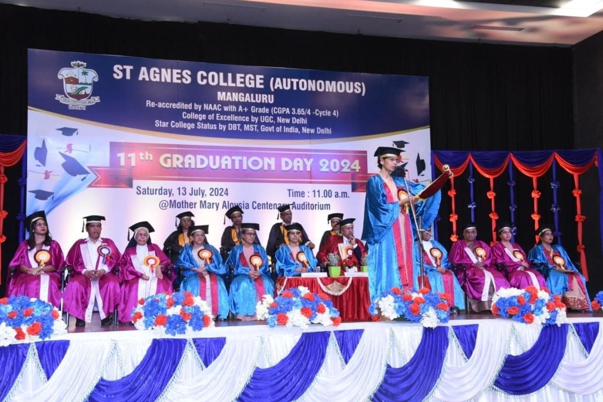 Sr. Dr. M Venissa A.C., Principal of the College administered the oath to the fresh graduates. Sr. Dr. Maria Roopa A.C., Joint Secretary of St. Agnes Institutions, Sr M. Sudeepa A.C., Secretary A.C. Educational Society, Sr. Carmel Rita A.C., Administrator graced this occasion with their presence. It was attended by the Deans of all streams, Members of various Board of Studies, Board of Examiners, Members of PTA of the College, the members of Governing Body and Academic Council of the College under Autonomy.