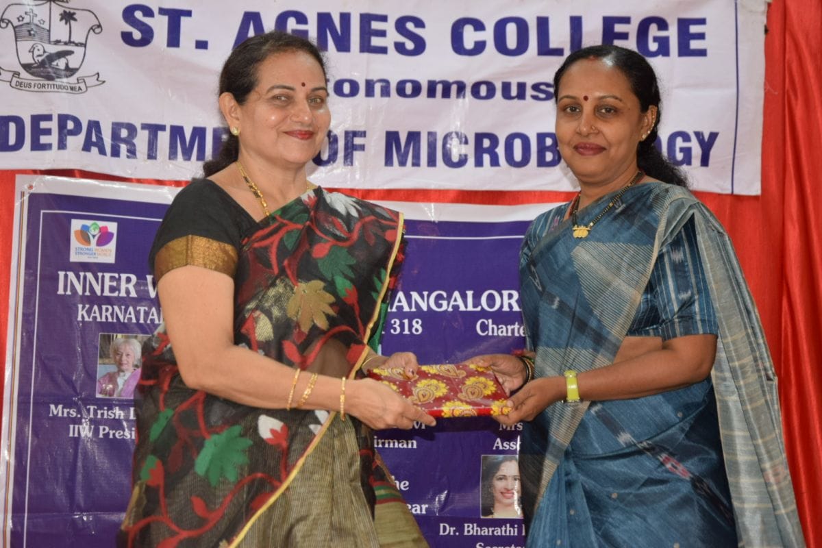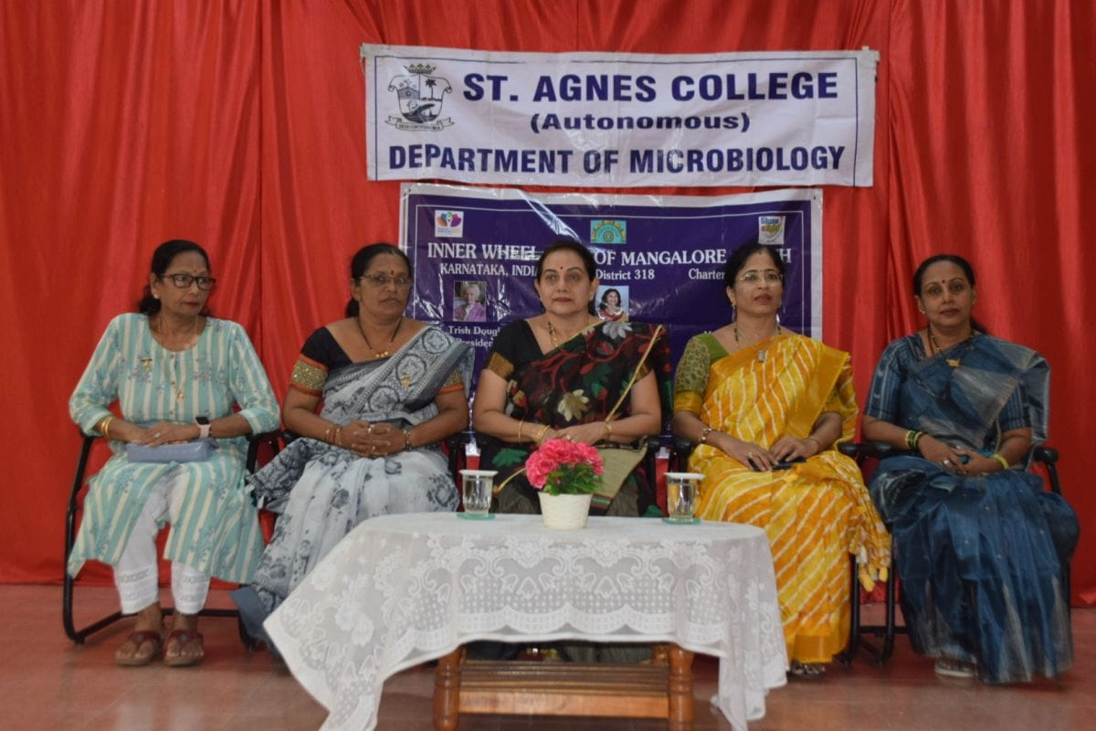 The session began with a meaningful prayer led by Calvina and team. Mrs. Mitra Prabhu, Dietician and Nutritionist, Zulekha College of Nursing, Mangalore; Mrs.Geetha Rai, President; Dr. Bharathi Prakash, Secretary and Mrs. Aruna Jalan, ISO, Inner wheel club of Manglore North; Mrs. Prajwal Rao,HOD, Dept of Microbiology, were present on the dias. Rifha from final year B.Sc. welcomed the gathering.