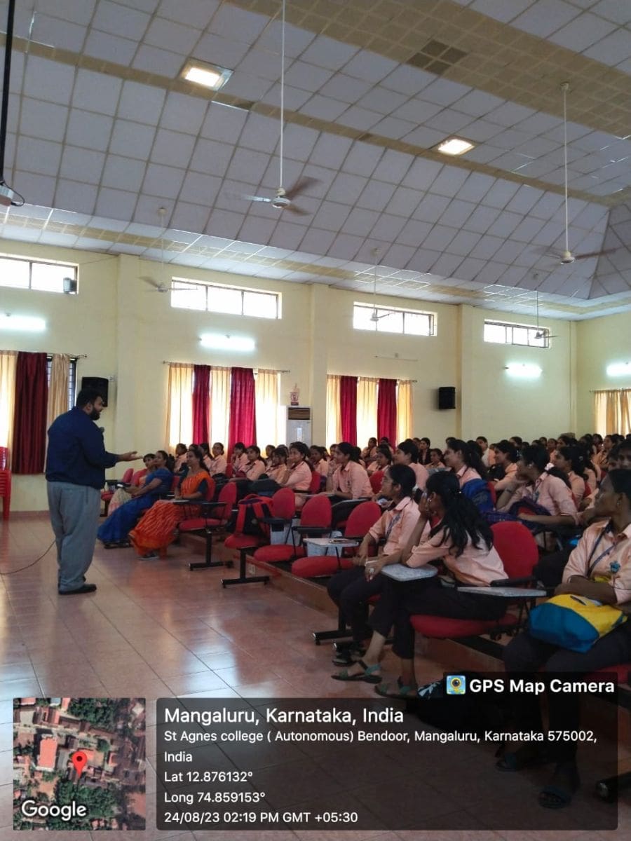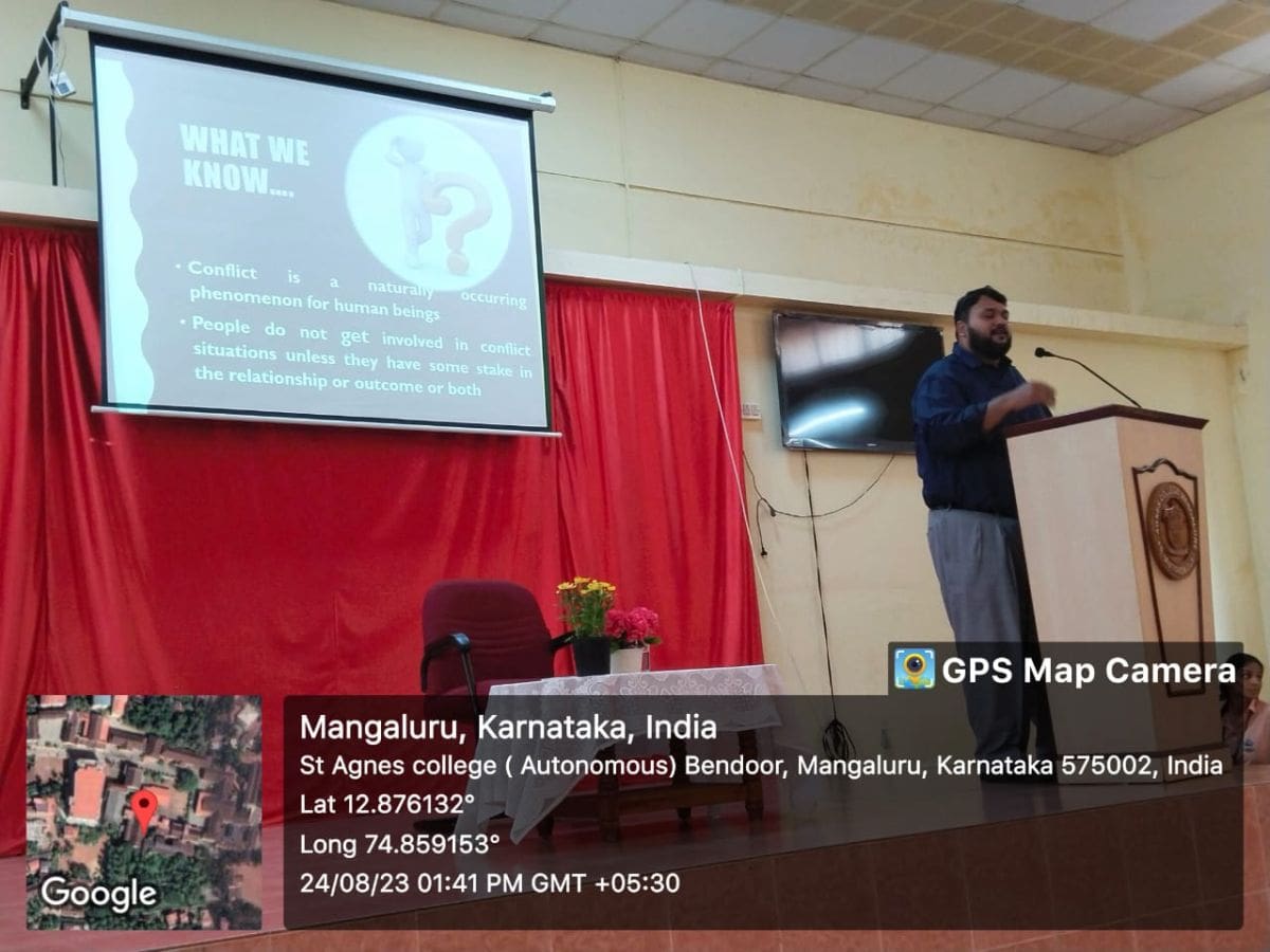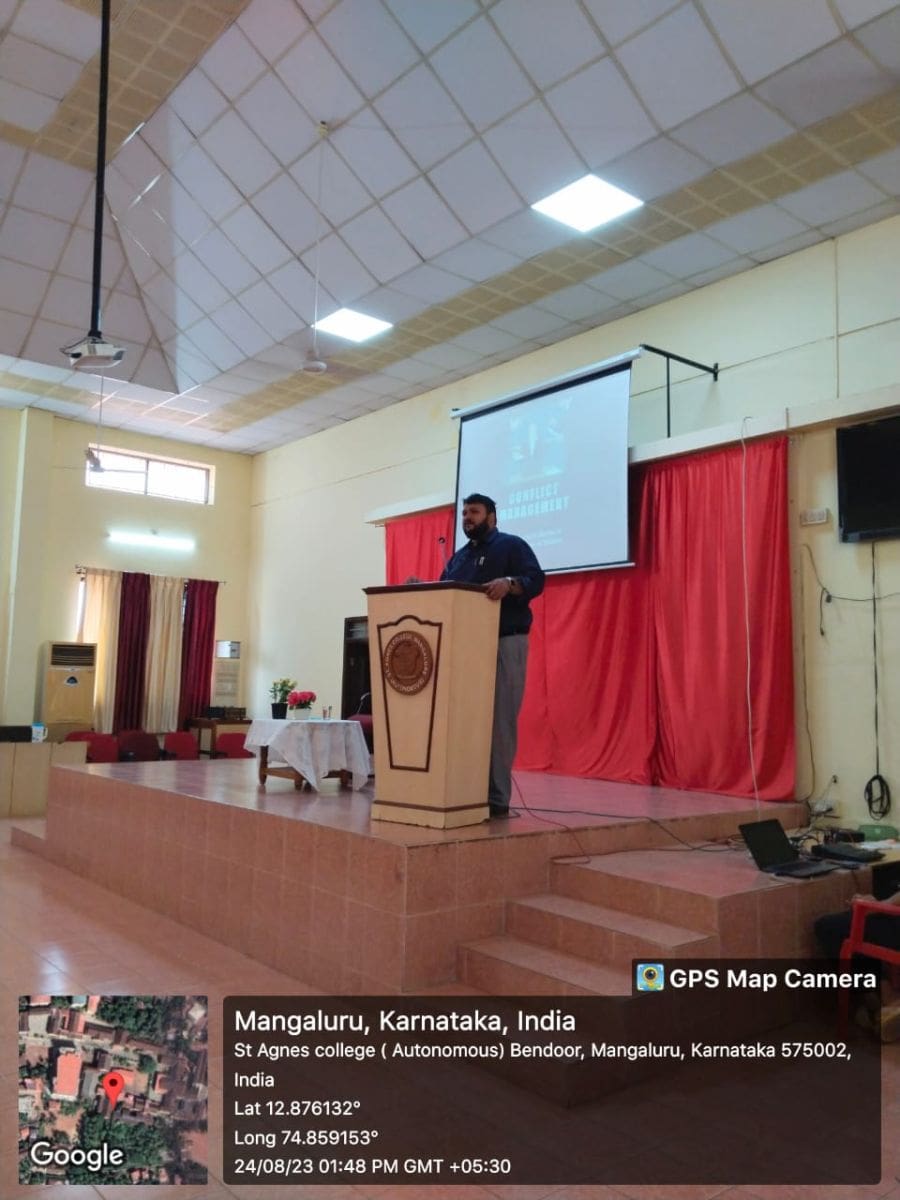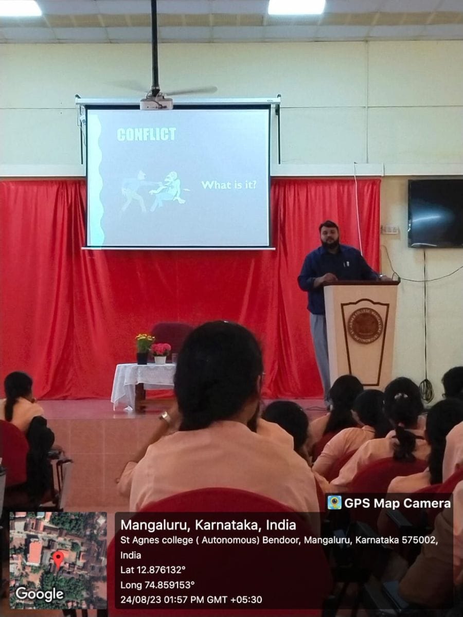 The Department of Commerce, St Agnes College (Autonomous), Mangaluru hosted a guest lecture on ‘Conflict to Confident’ on 24 August 2023. Mr Samarth Shenoy B, Assistant Professor, Sahyadri College of Engineering & Management, Adyar, Mangaluru, was the guest speaker.
