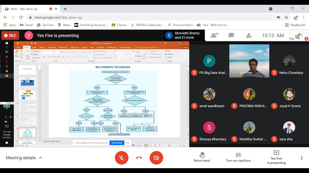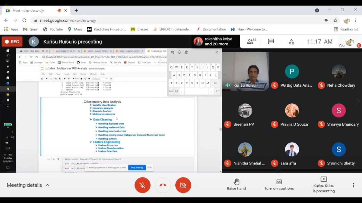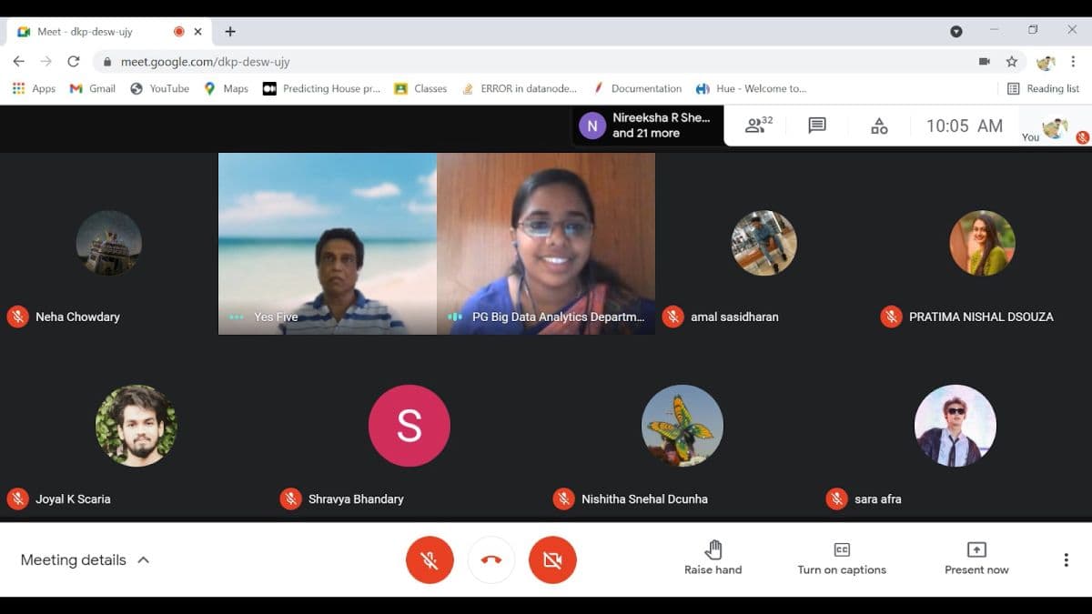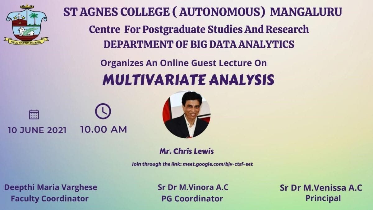 The Guest Lecture on Multivariate Analysis was conducted on 10 June 2021 by the Department of Big Data Analytics, Centre for Post Graduate Studies and Research, St Agnes College (Autonomous), Mangaluru on the Google meet platform where staff and students from 1st and 2nd year of Big Data Analytics were present. The resource person was Mr Chris Lewis, who briefed on data analytics and related topics of Factor analysis, Discriminant Analysis. The resource person demonstrated interesting programming exercises in Python for Multivariate analysis and briefed on Big Data Analytics using Hadoop MapReduce. The Guest Lecture was coordinated by Ms Deepthi Maria Varghese. The Guest Lecture’s highlight was the question and answer session where the resource person answered students’ queries on data analytics from an industry perspective. Students participated very enthusiastically during the Q&A session.