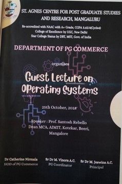 A Guest Lecture on Operating Systems was organised by the PG Department of Commerce, St Agnes College (Autonomous), Mangaluru on 25 October 2018. The resource person was Prof Santosh Rebello, Dean MCA, AIMIT, Kotekar, Beeri, Mangaluru. The Inaugural started with a prayer, followed by the welcome. The main objective of this session was to inculcate users a convenient interface to use the computer system.