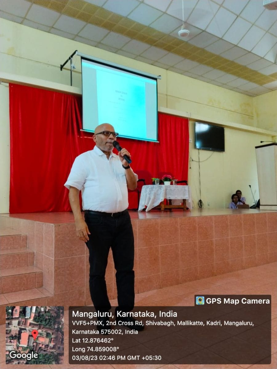 The speaker addressed the gathering on the topic ‘Brain Drain vs Retain’. CA Valerian spoke of his experience in his work life and how the times have changed, and questioned the students on their future plans regarding their place for placement. He spoke of numerous opportunities in Mangalore as a trade hub, and the opportunities granted by retirees, such as himself, in nurturing businesses and new ventures.