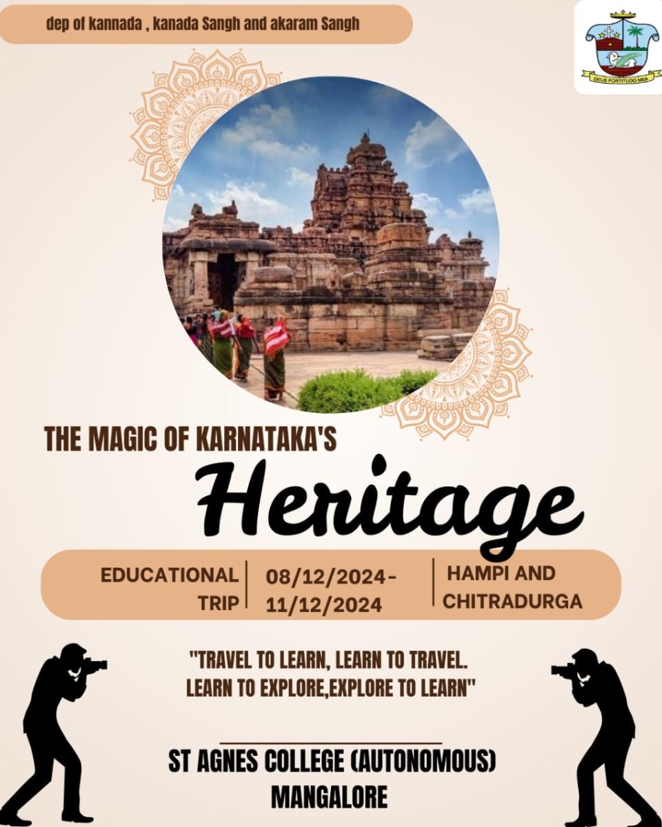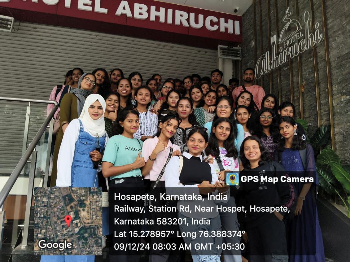 The Department of Kannada, Kannada Sangha and Akaram Sangha organised an educational tour to Hampi and Chitradurga on 8th – 11th December 2024 as part of its curriculum. A group of 45 students visited various notable destinations, including Hampi Virupaksha Temple, Hazararama Temple, Lotus Mahal, Elephant Stable, Queen Bath, Museum, Hampi Bazar, Vijaya Vittala Temple, TB Dam, Chitradurga Fort, Chandravalli Cave, Muruga Matta. This tour provided students with hands-on-learning experiences and exposure to Karnataka Culture.